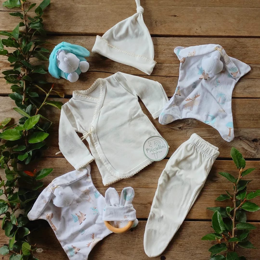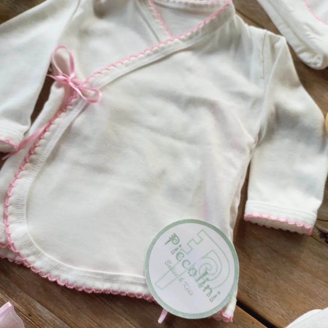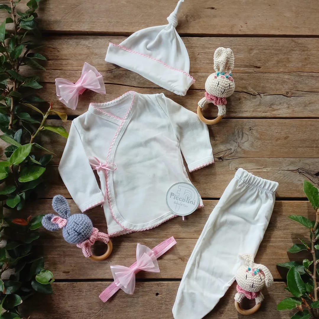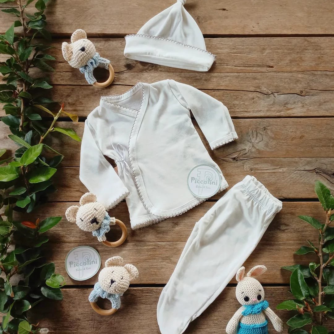 Ajuar de 3 piezas compuesto por ranita (pantalón con piecito), body y gorrito. Confeccionado en interlock de primera calidad con terminación en picot. En talle único abarca de 3,5 a 4,5kg aprox.