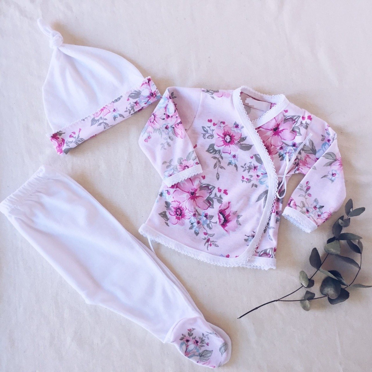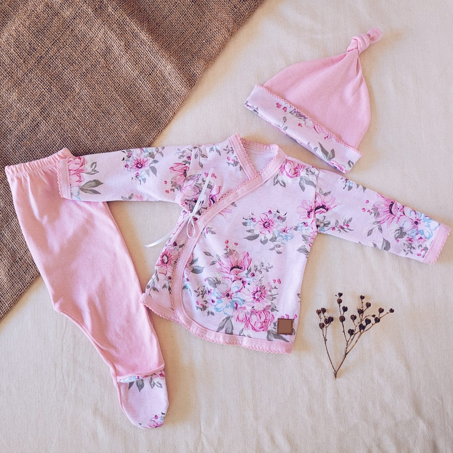 Ajuar de 3 piezas de algodón de primera calidad consistente en batita, gorrito y medio osito. La batita y el gorrito cuentan con terminaciones en picot. Talle para 3,5 a 5,5 kg aprox.