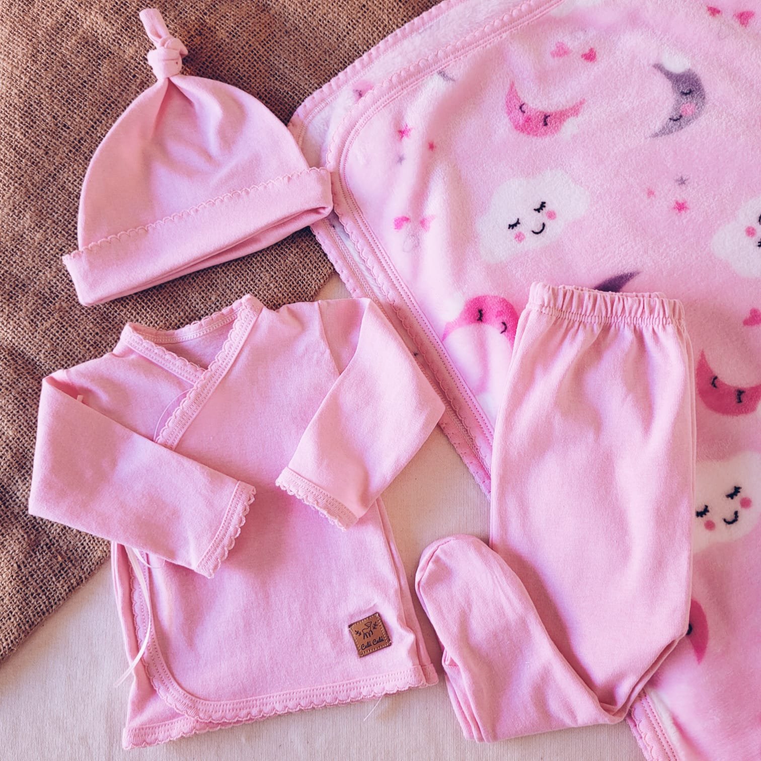 Ajuar de beba confeccionado en algodón premium compuesto por batita, ranita y gorrito.