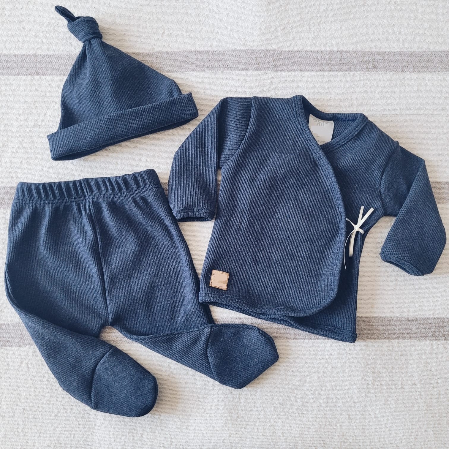 Ajuar confeccionado en morley de algodón compuesto por una batita, una ranita, un gorrito y una bandana de morley de algodón