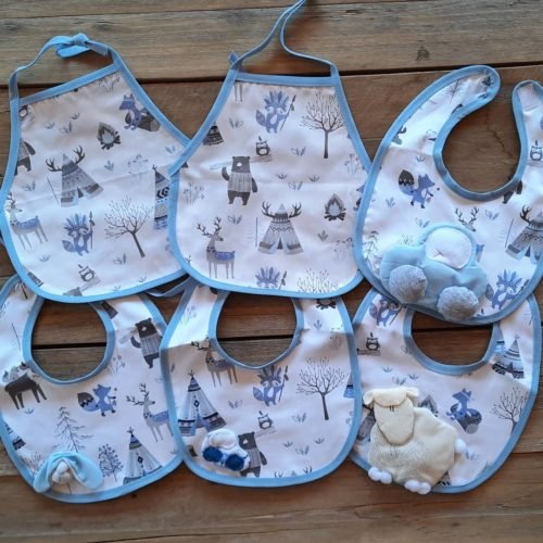 Babero para bebé. Se atan detrás del cuellito con cintas de algodón al tono, vienen 3 modelos, uno con tela impermeable delante y detrás, otro con un aplique divertido para que el bebé juegue y el tercero con un aplique más grande que posee un chifle que al presionarlo hace un ruidito.