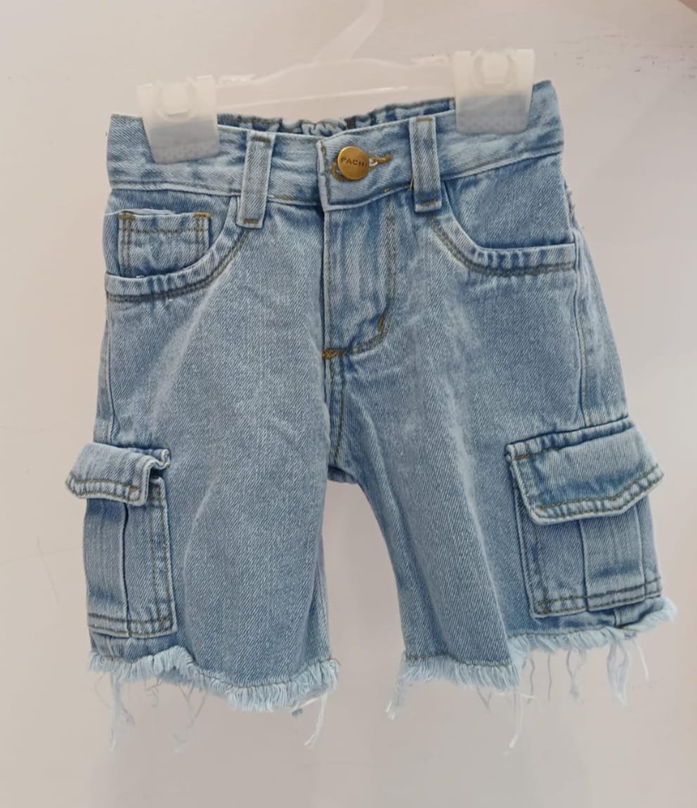 Bermuda de jean de niño tipo cargo con bolsillos laterales y cintura elastizada.