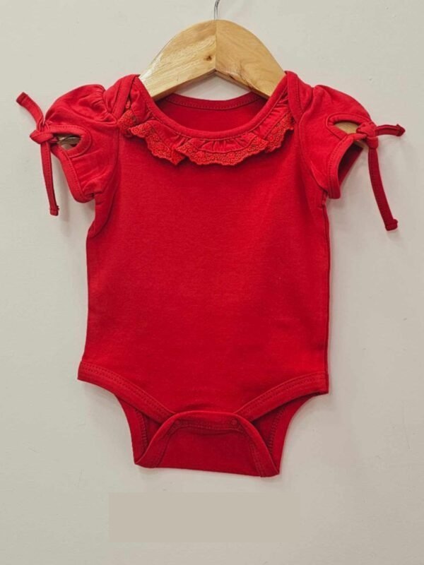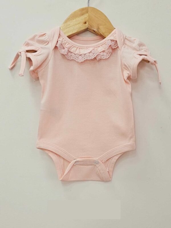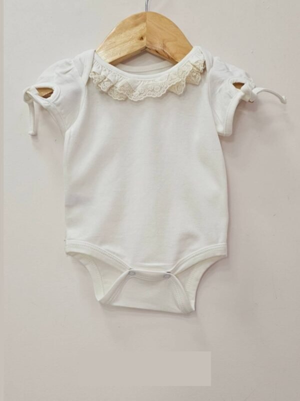 Este hermoso body, viene con cuello tipo americano, volado en el cuello con detalle de puntilla de tul al tono, mangas con frunces y tiritas para atarlas, con dos broches metálicos pañaleros