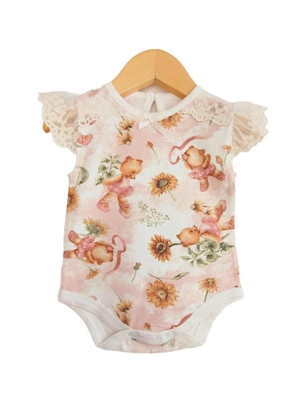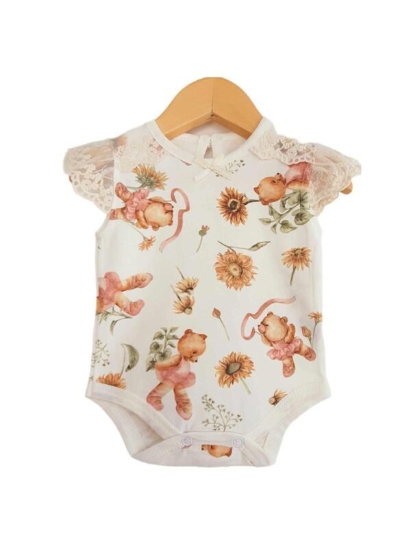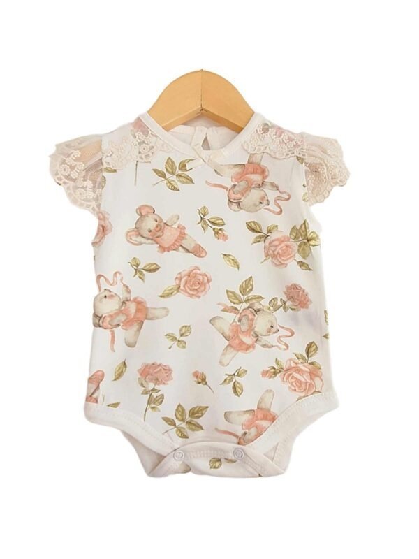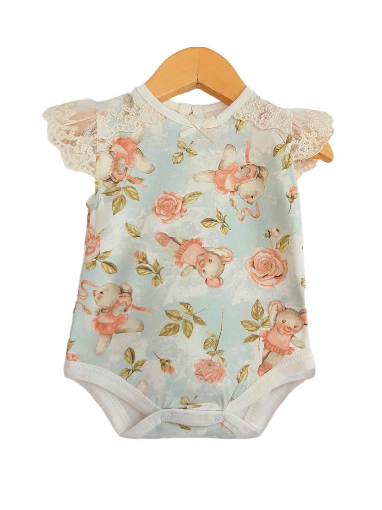 Este hermoso body viene con delicadas estampas, puntilla de tul en hombros y brazos, detalle de moñito, dos broches pañaleros y un botón en el cuellito.