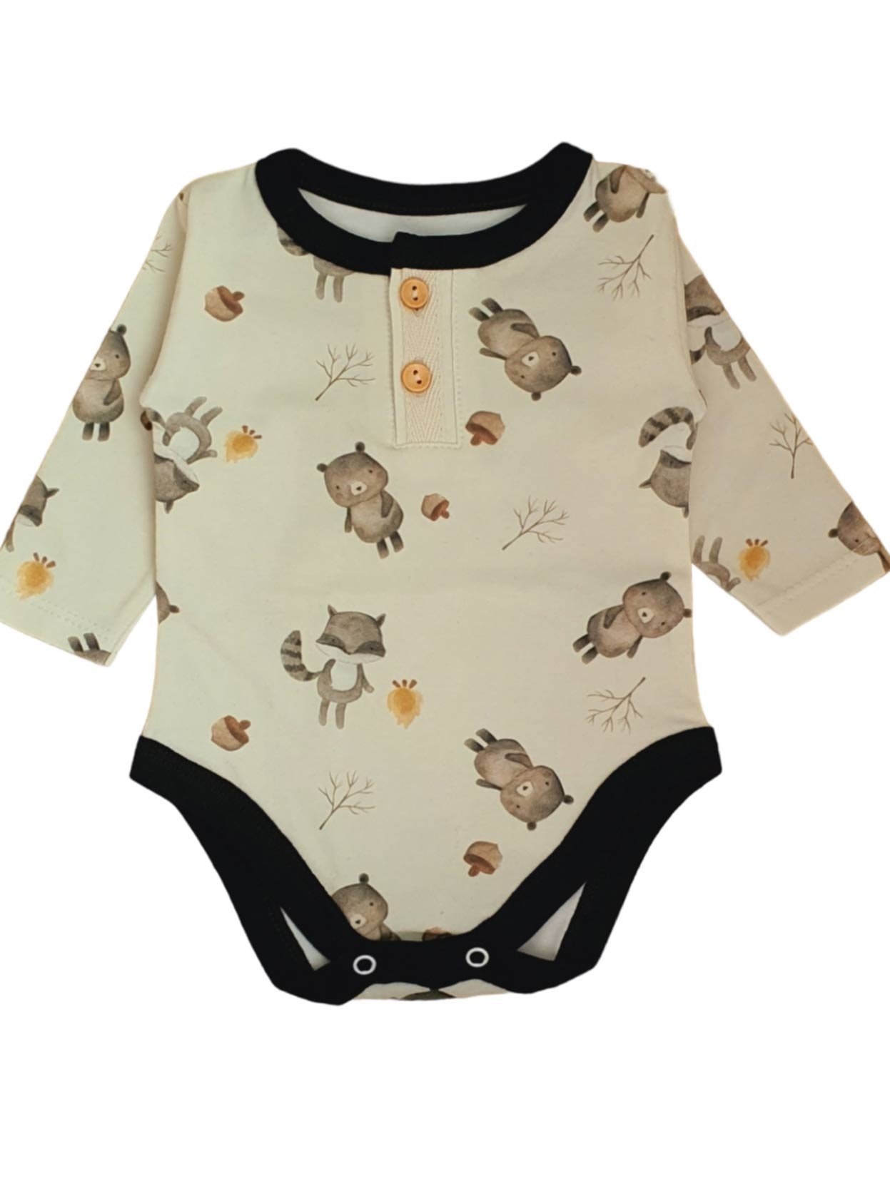 Este hermoso body de varon, viene estampado con diseño de animales, trae carterita en el cuello, con dos botones simil madera para abrir, y dos broches metálicos blancos para abrir la parte de abajo..