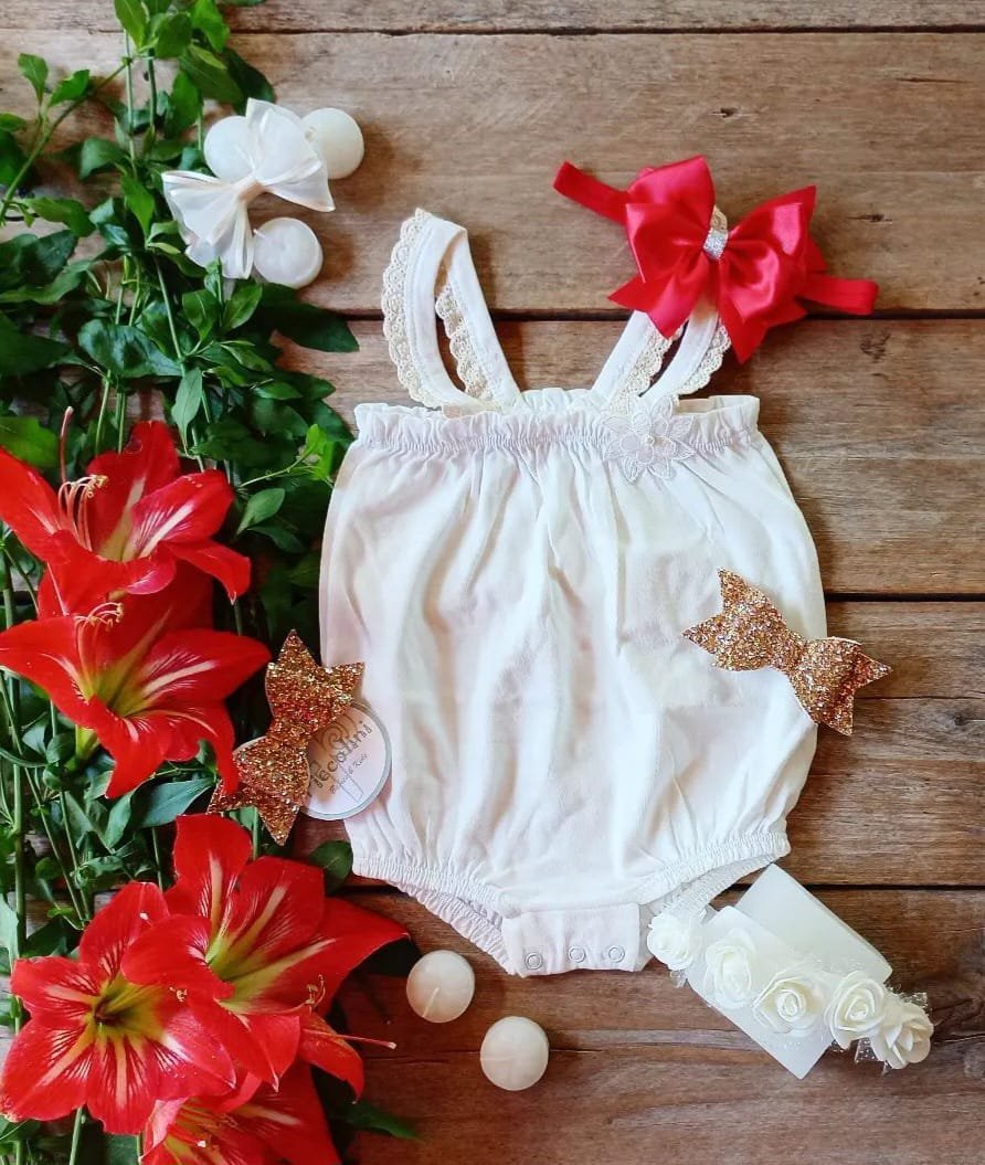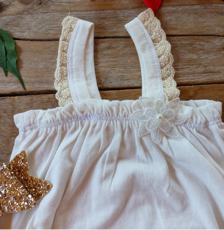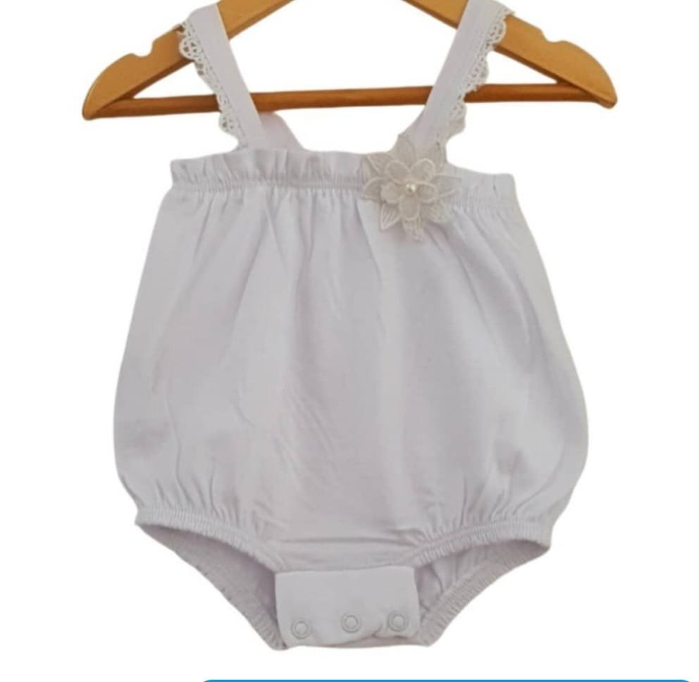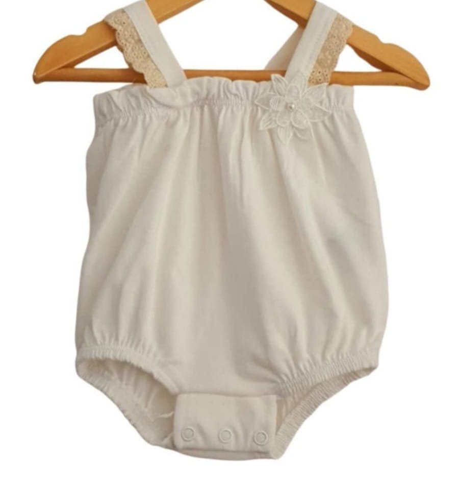 Body de beba confeccionado en jersey peinado 100% algodón. Este modelito viene con breteles regulables con 3 botones, con detalles de puntillas al tono. Refuerzo de elástico arriba y abajo, en las piernas. Un detalle de flor con perlita en el pecho y 3 botones pañaleros.