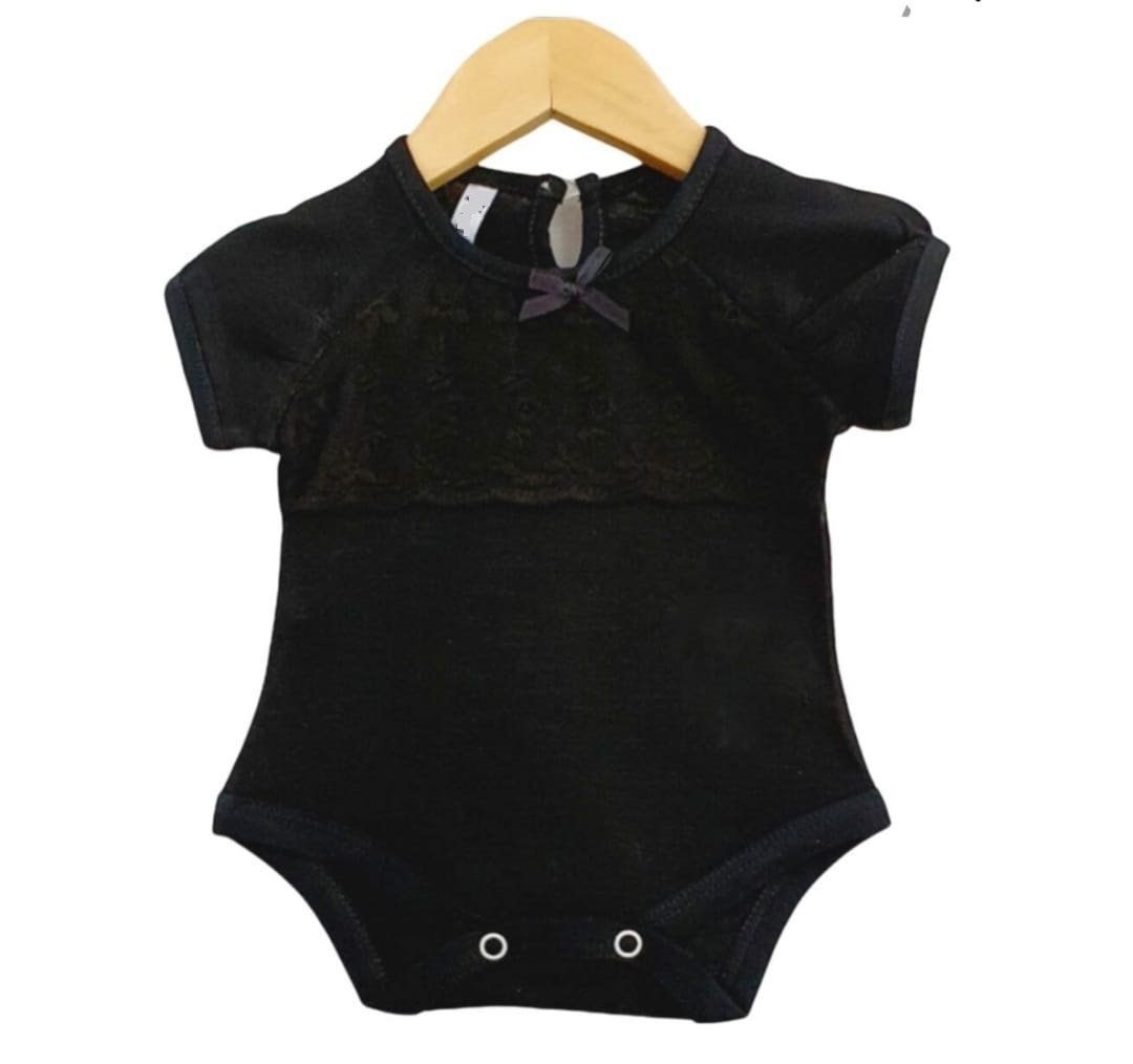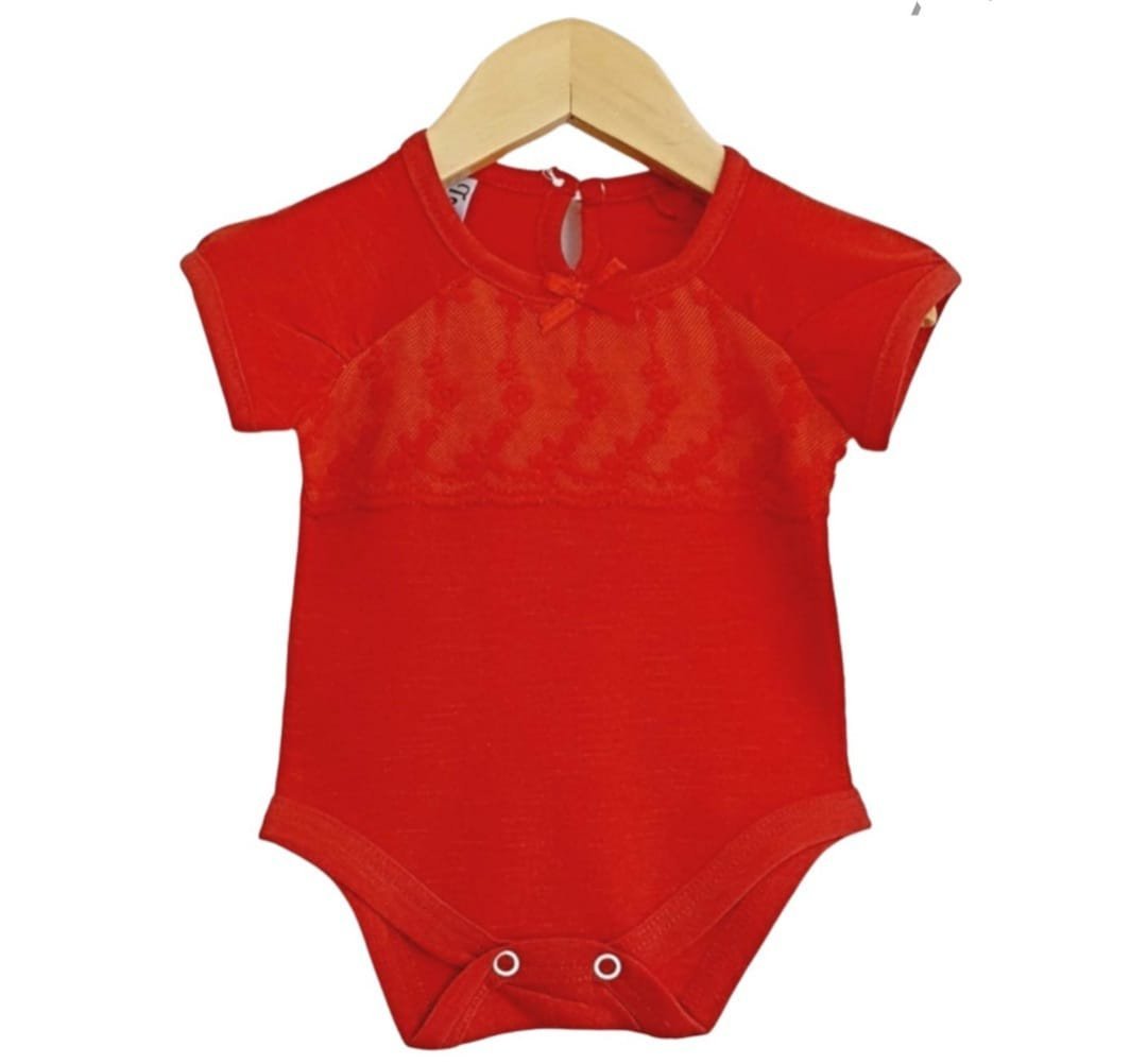 Body de beba confeccionado en jersey pluma flame, 100% algodón peinado. Este modelo viene con broderie tul al tono, botón blanco para abrir el cuellito, detalle de moño al tono y dos broches pañaleros.
