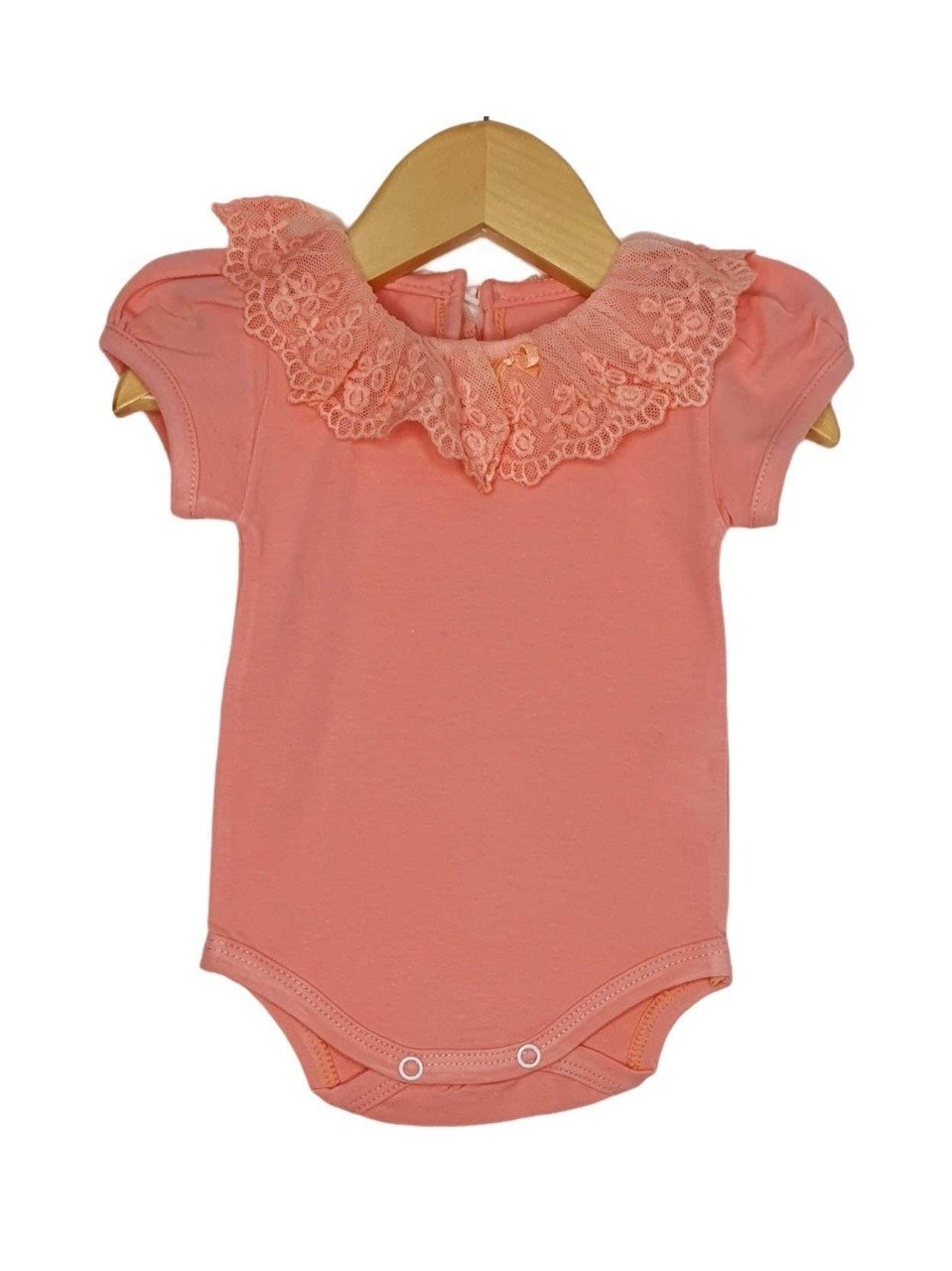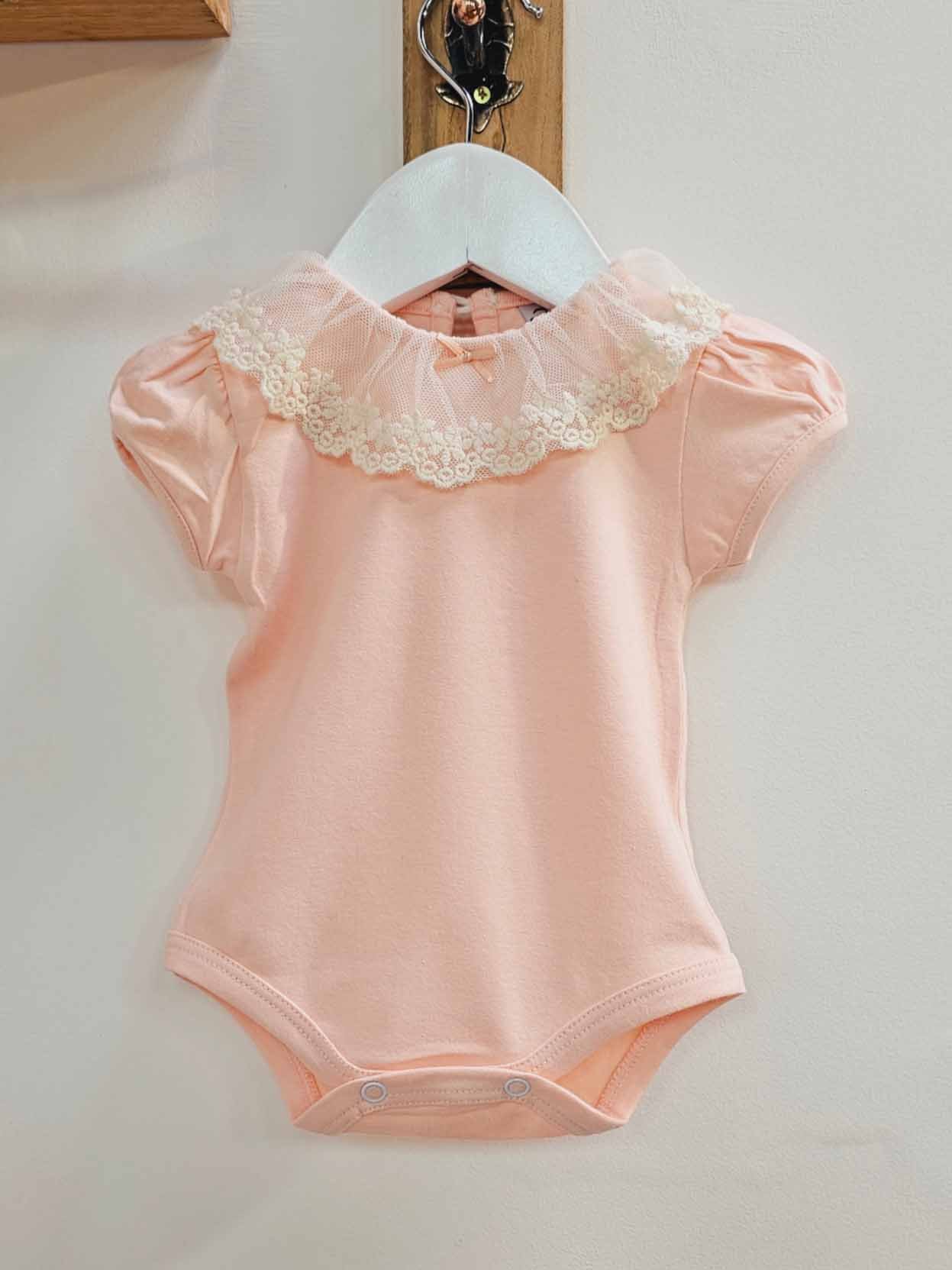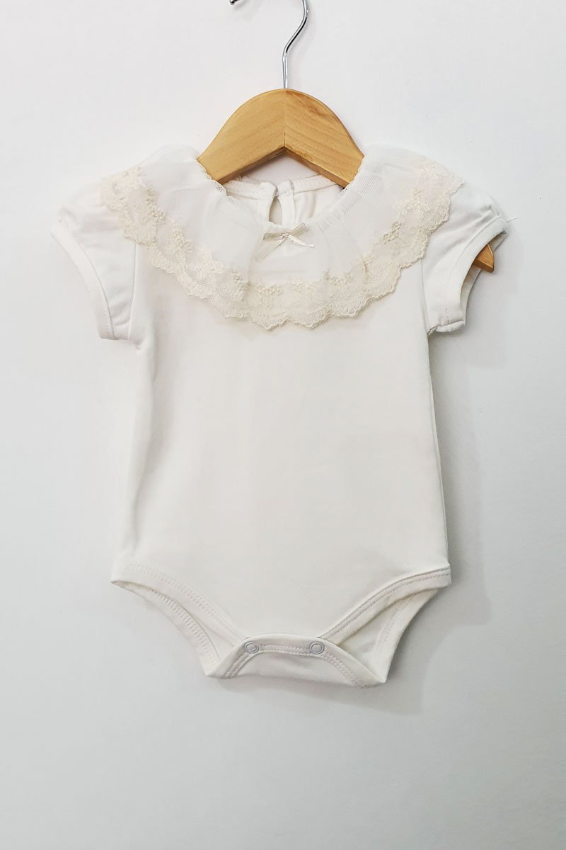 Body con broderie manga corta, hecho en algodón orgánico  y elastano. Con una delicada puntilla en el cuello y botón.