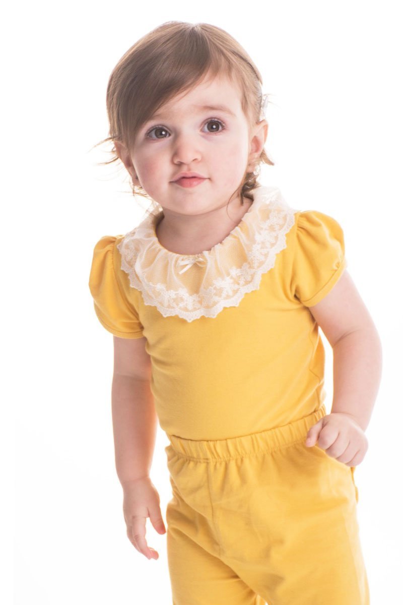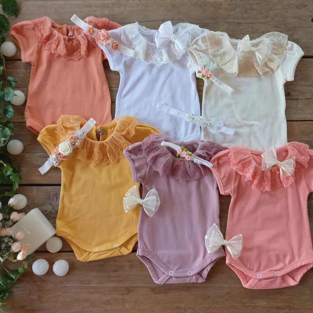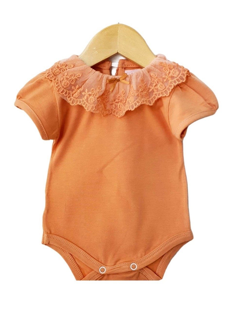 Body con broderie manga corta, hecho en algodón orgánico  y elastano. Con una delicada puntilla en el cuello y botón.