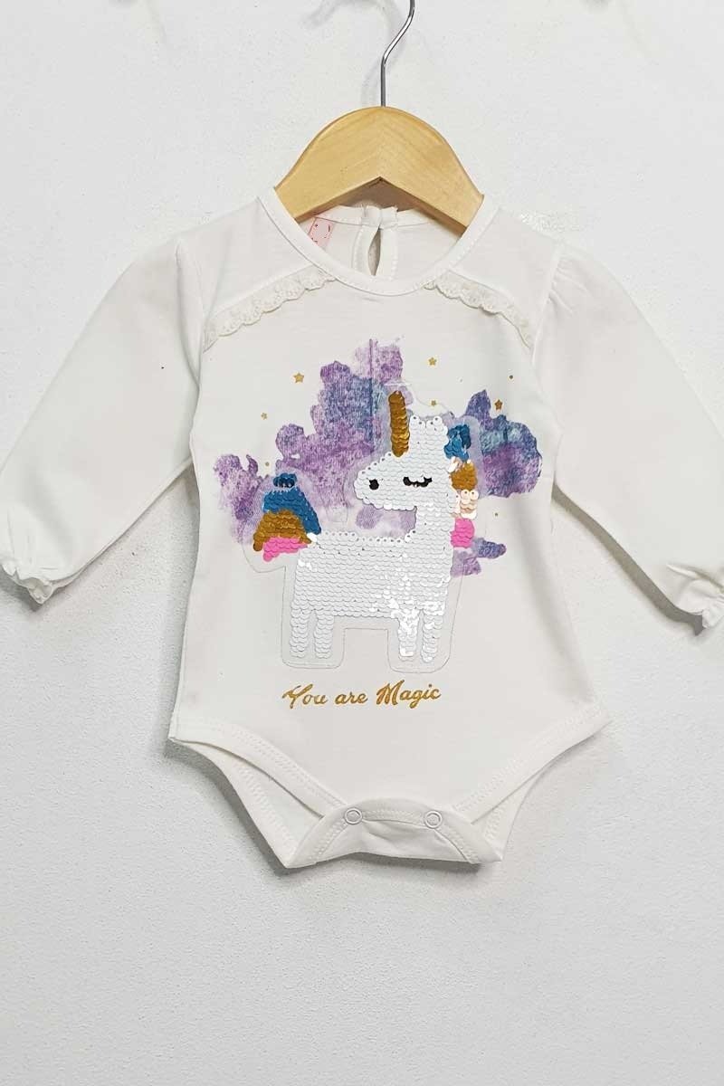 Body de 94% de algodón con 6% de elastano, lo que lo hace super suave y elastizado. Con estampa de unicornio de lentejuelas, botón en la parte de atrás del cuello y broches pañaleros a presión.
