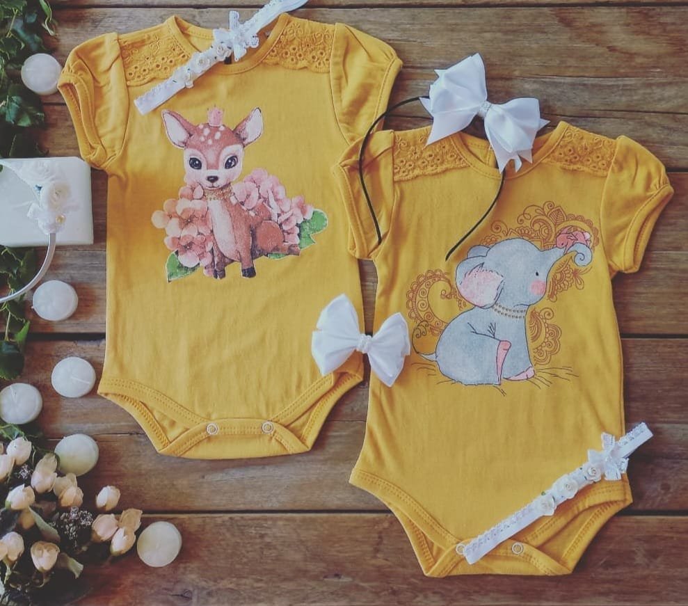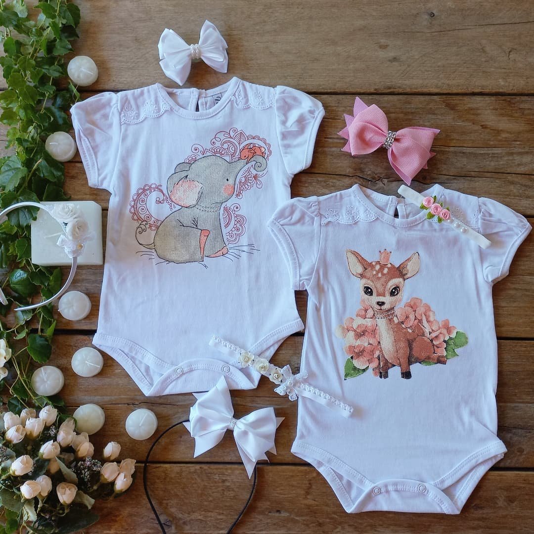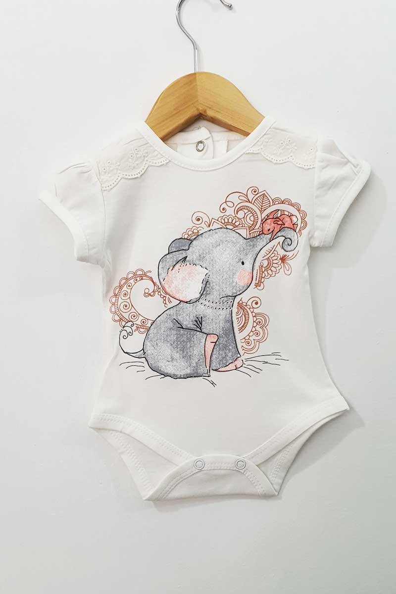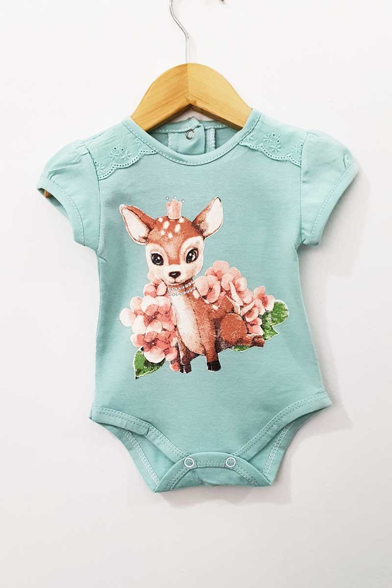 Body de beba, hecho en algodón orgánico al 100%. Este modelo viene con una delicada puntilla en las mangas, estampas de bambi o elefante.
