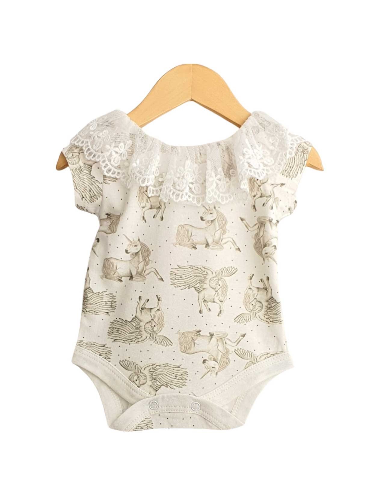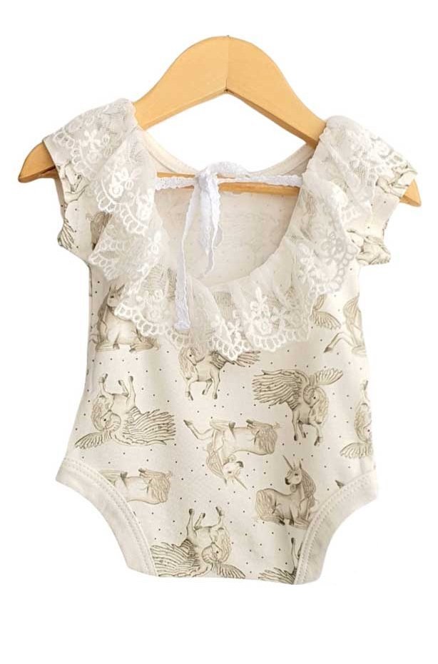 Body con espalda baja de corte estilo ballerina, confeccionado en jersey 100% algodón peinado estampado con diseño de unicornios, puntilla en el cuello y espalda, con cinta al tono para atar en la espalda y 2 broches pañaleros.