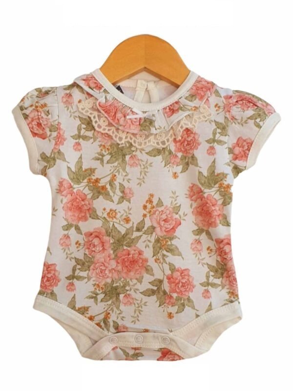 Tiene una delicada estampa en diseño floral, viene con volados en broderie al tono. Trae tres broches metálicos pañaleros y un botón al tono para abrir el cuellito.