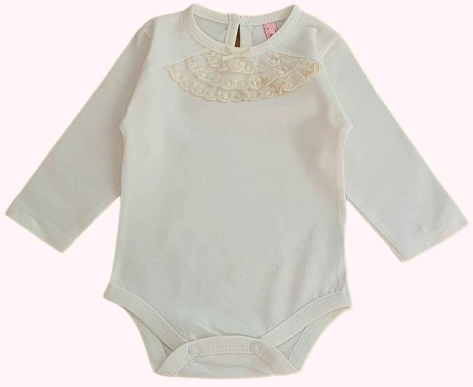 Body hecho 100% en algodón peinado. Con 3 volados de tul en el cuello y botoncito atrás.