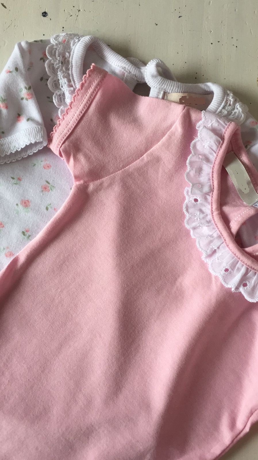 Delicado body de algodón de primera calidad, manguita corta, con puntilla en el cuello y cinta de algodón por detrás para atarlo en el cuellito.