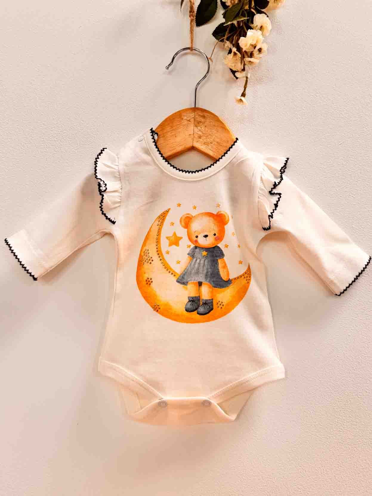 Este modelo de beba, confeccionado en suave jersey de 100% algodón calidad premium, lleva detalles de bordado estilo picot en cuellos, hombros y puños, también viene con una bella estampa de osita en la luna con piedritas brillantes. LLeva 3 broches blancos metálicos, 1 en el costado del cuello y 2 pañaleros
