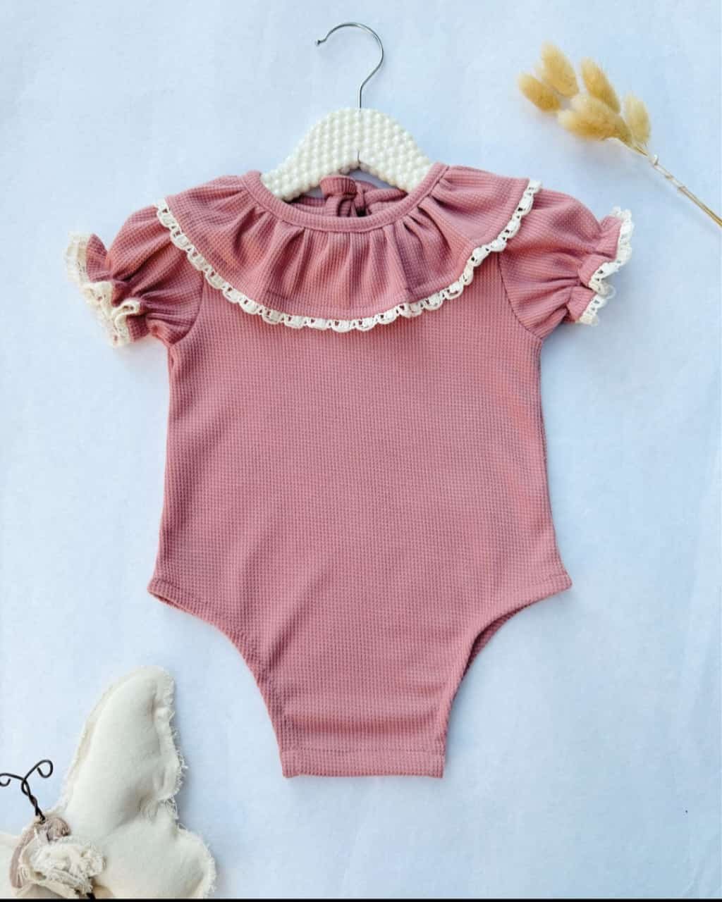 Este body tiene un hermoso cuello confeccionado en la misma tela del body con un detalle de puntilla de algodón en el borde. Tiene dos botones pañaleros y elástico en las manguitas.