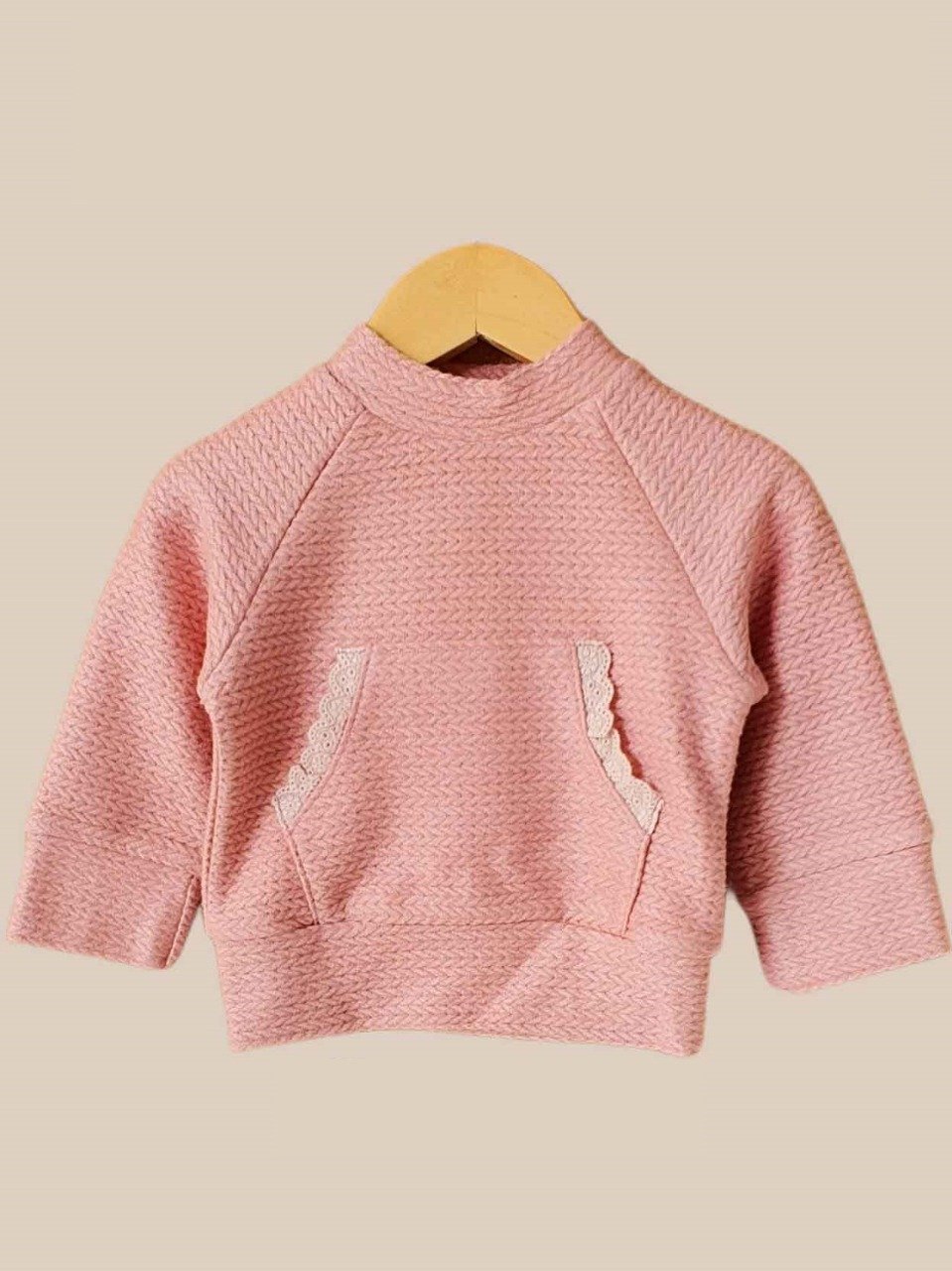 Buzo hecho en lanilla de polyester liviana con bolsillo canguro con detalle de puntilla y broches a presión en el cuello para abrirlo. Tiene manga ranglan por lo que el largo de manga se mide desde el puño hasta el cuello.