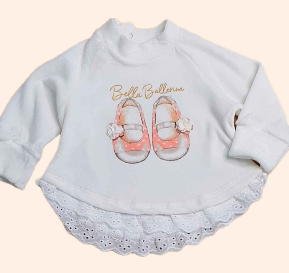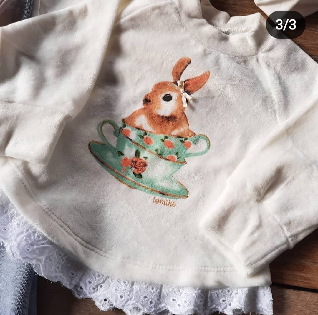 Buzo confeccionado en plush polyester con delicada estampa y broderie en la parte inferior, manga ranglan y broche a presión en el cuello. Para tomar las medidas en este caso se mide del puño hasta el cuello.