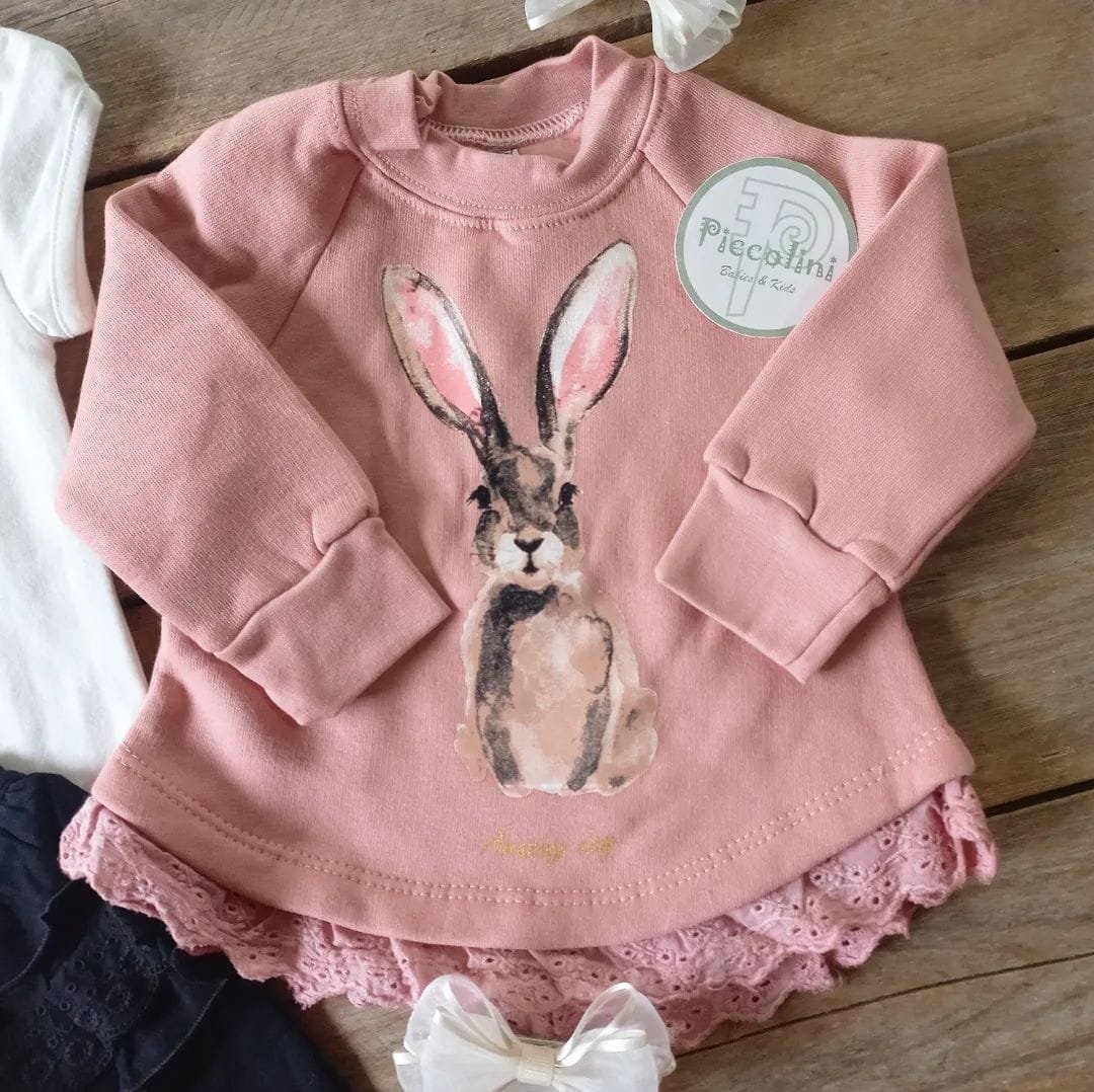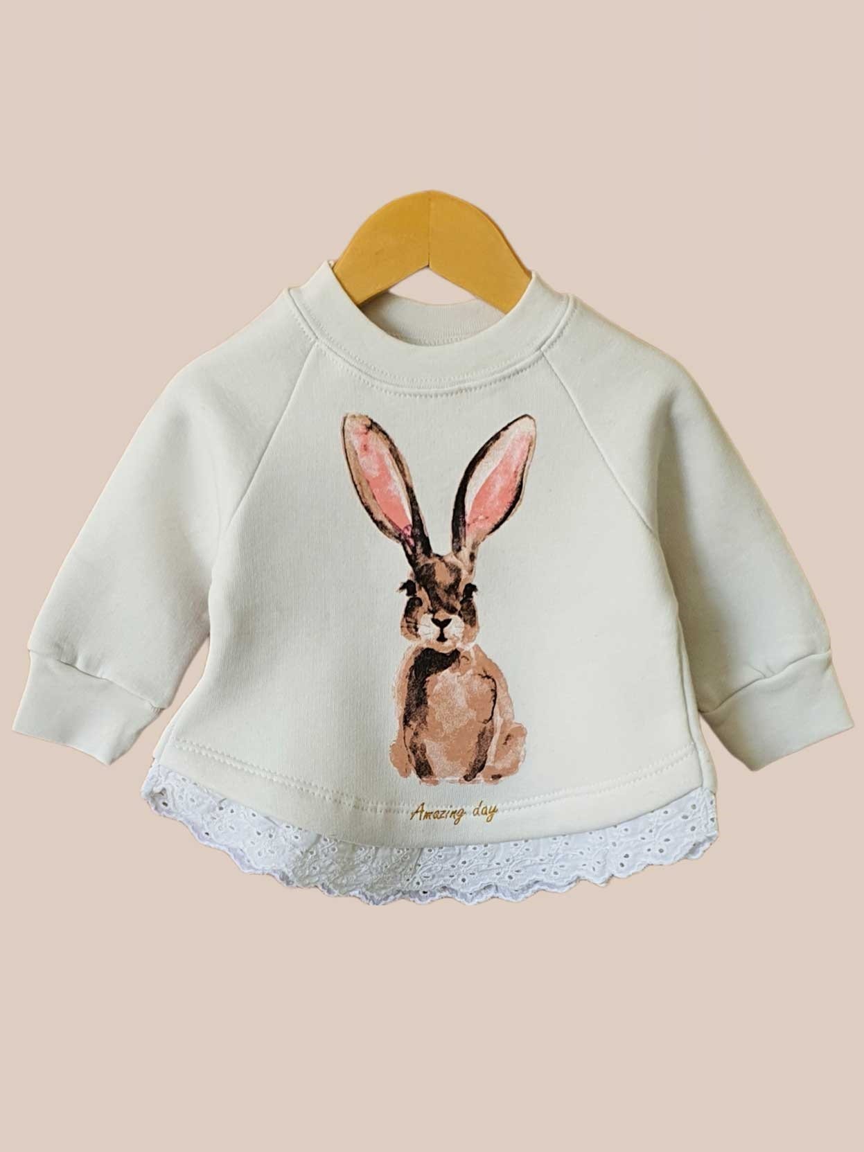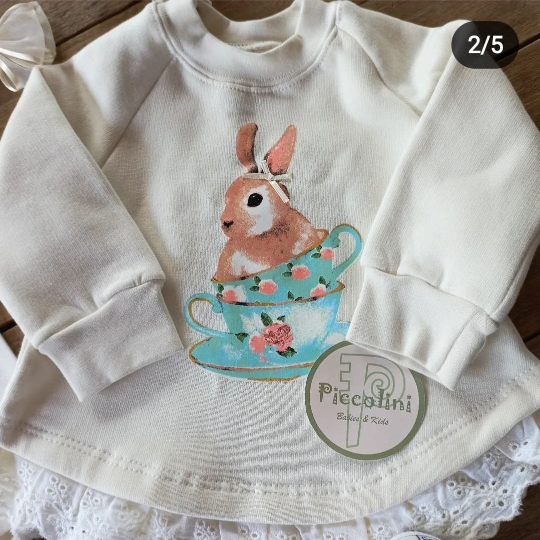 Buzo de algodón frizado con estampa. Con broches a presión en el cuello para que quede bien cerradito y detalle de broderie en el ruedo. Tiene manga ranglan por eso para medir el largo de manga se mide desde el puño hasta el cuello.