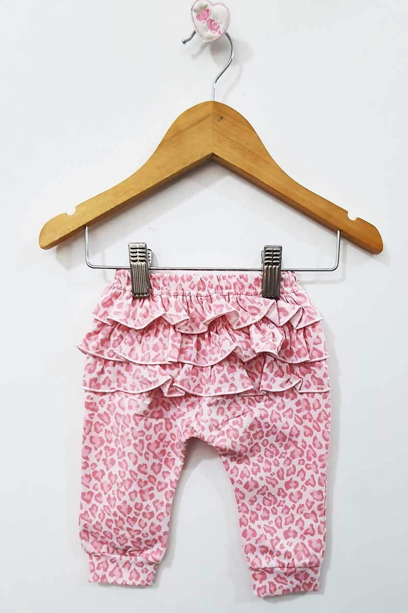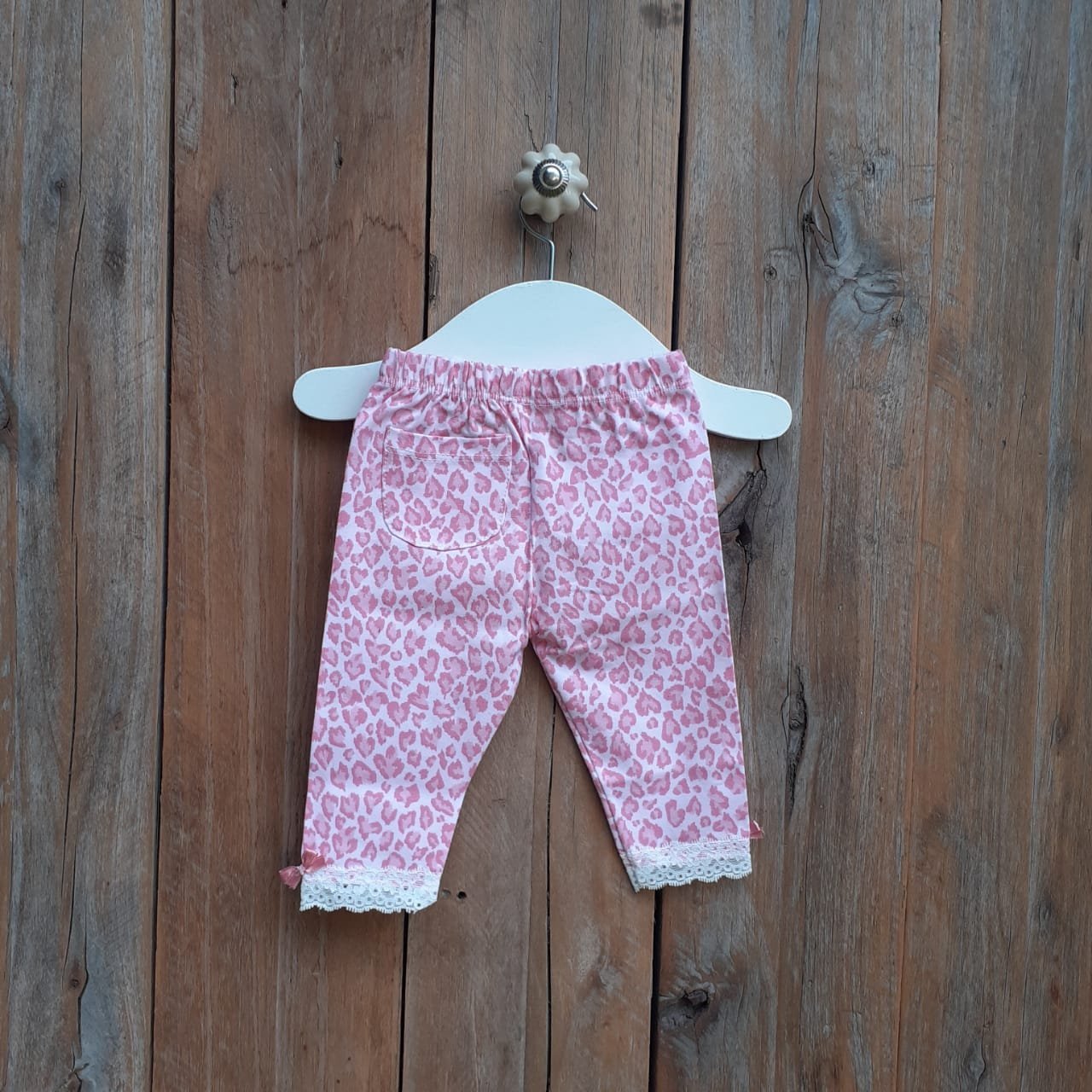 Calza de algodón con lycra estampada en animal print con bolsillo y detalle en los tobillos de puntilla y moños de raso y calza de algodón con elastano con detalle de volados en la espalda.