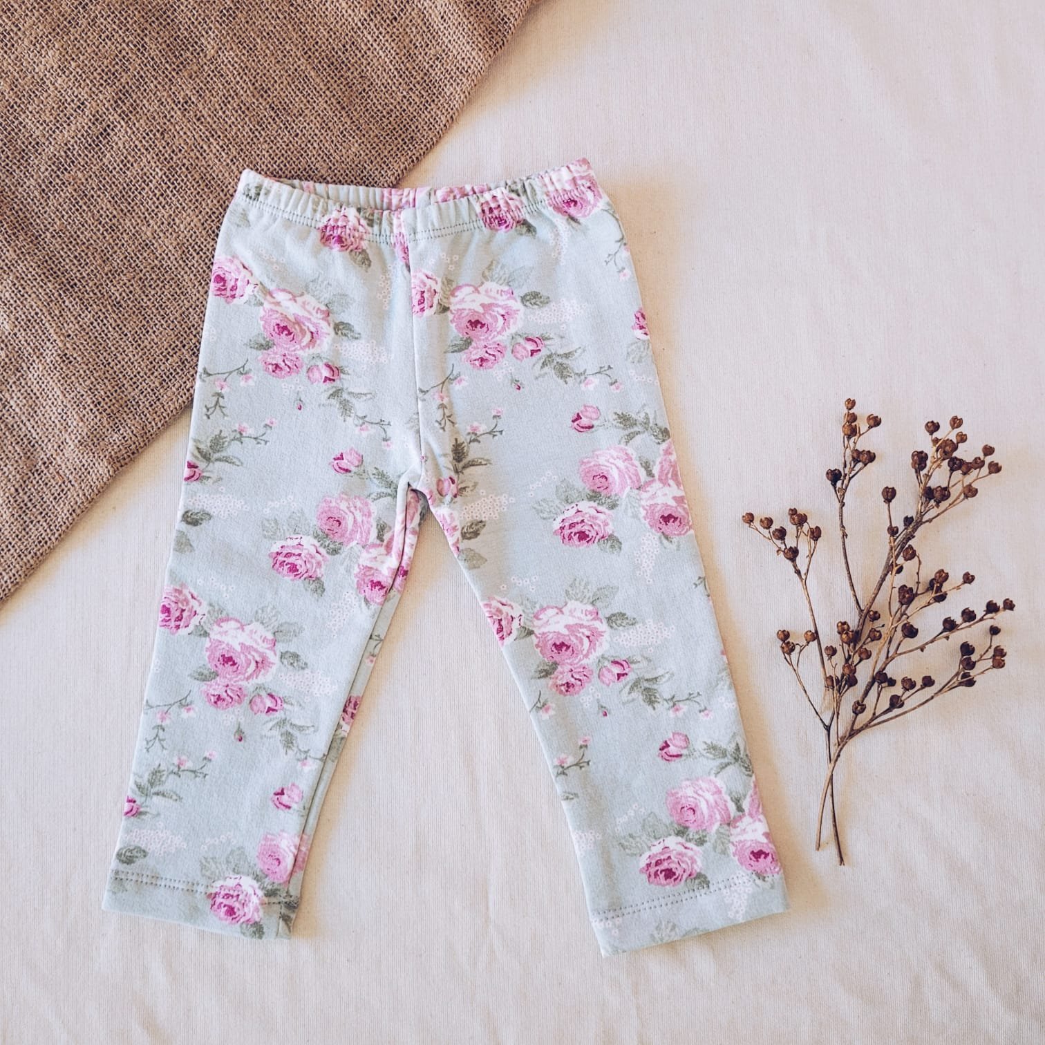 Pantaloncito legging confeccionado en frisa de algodón elastizada con estampa floral en verde agua.