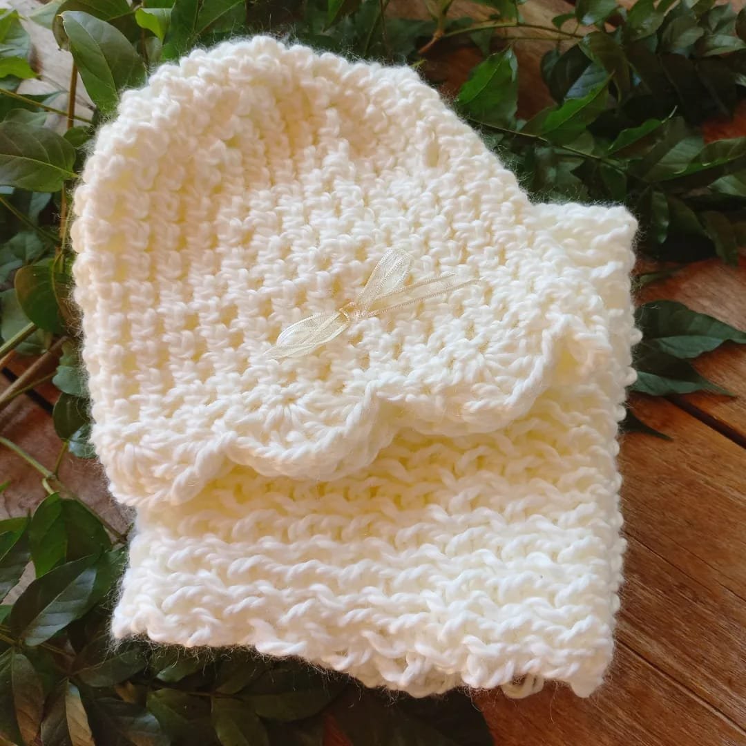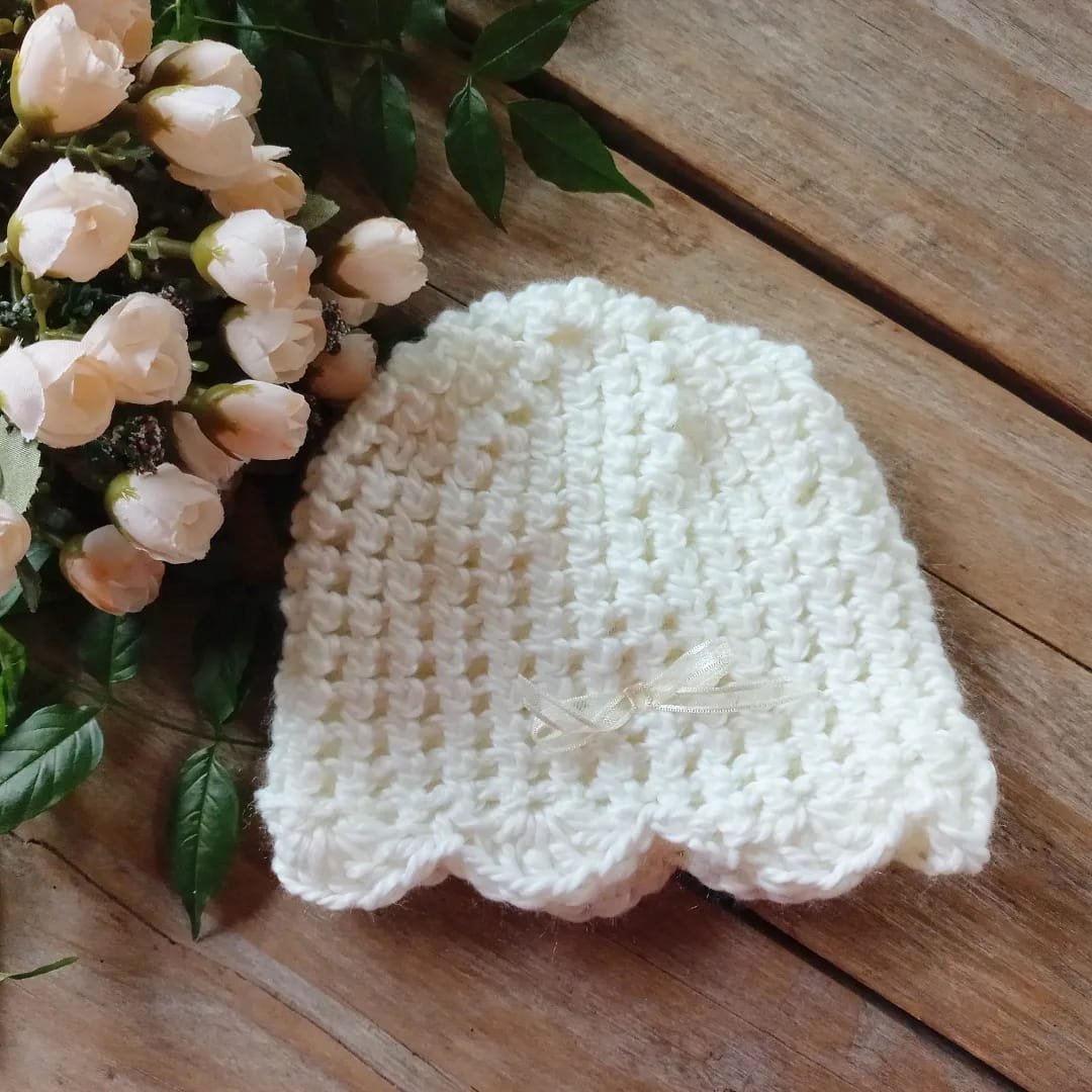 Gorrito tejido en lana acrílica sedificada. Hipoalergénica, ideal para bebés y niños pequeños. Estilo vintage con aplique de moñito de organza.