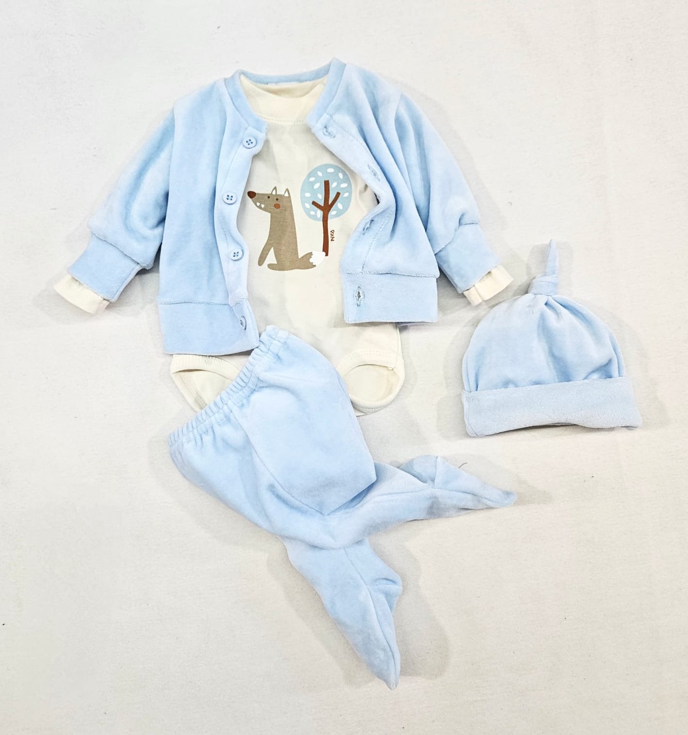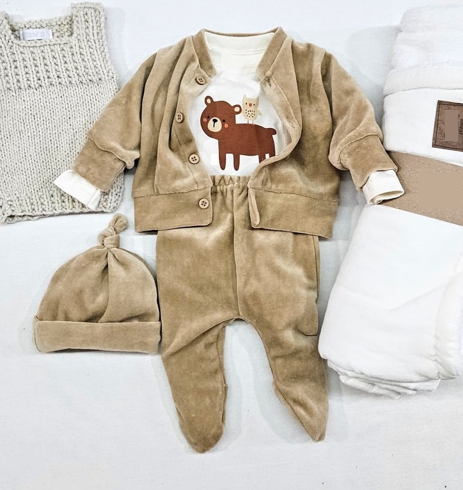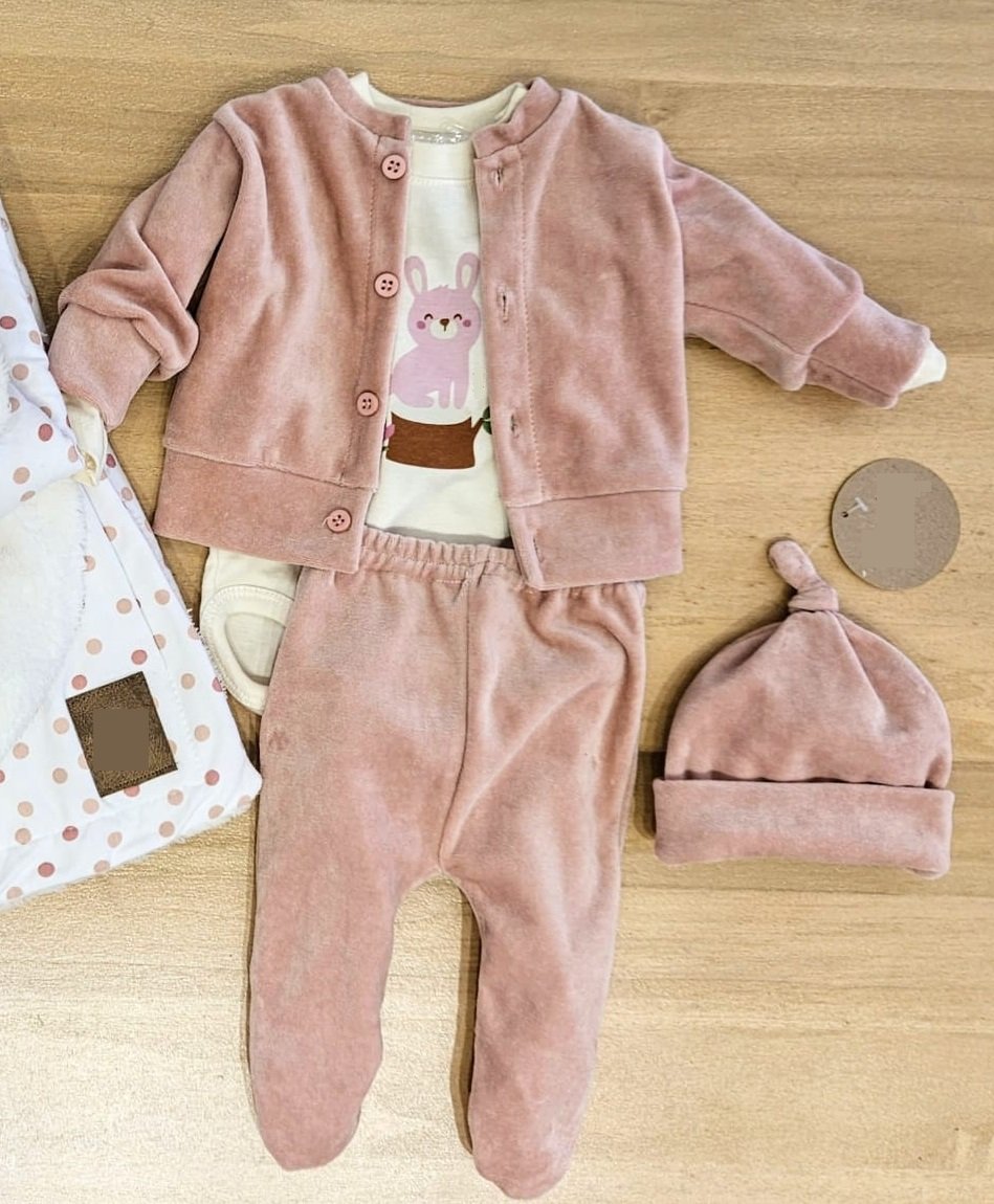 Conjunto tipo ajuar compuesto por 3 piezas. Body de algodón con estampa, ranita y camperita confeccionados en plush.