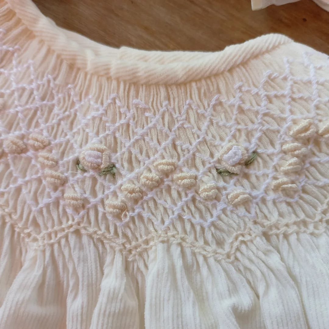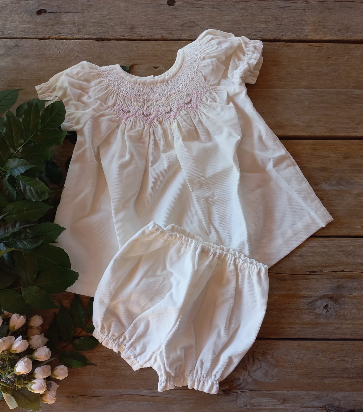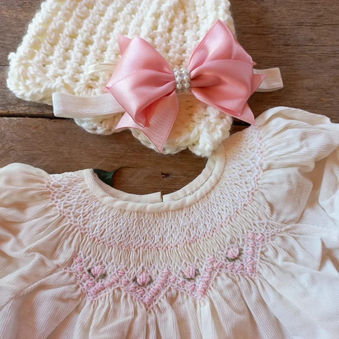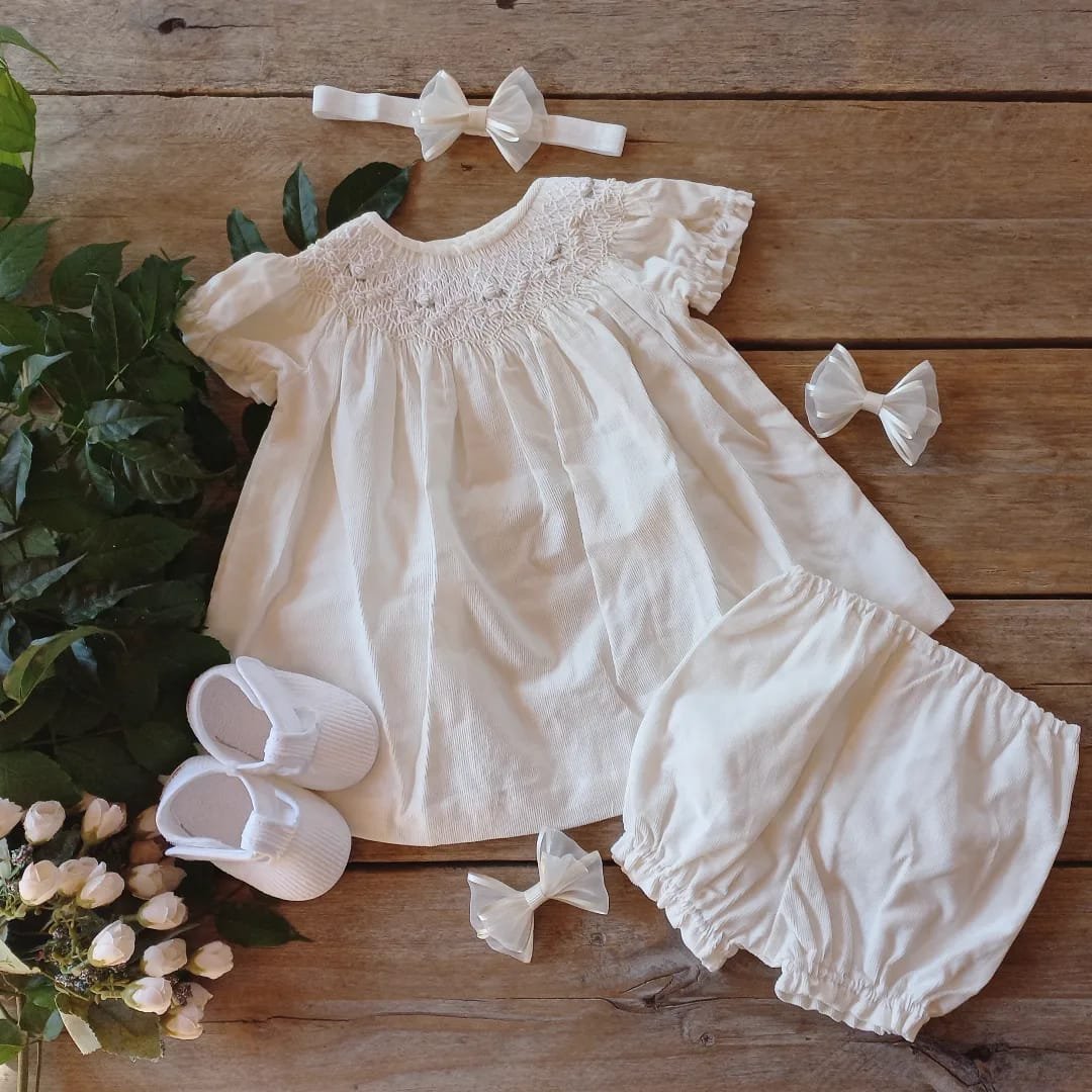 Este vestidito viene con su cubrepañal en conjunto, haciendo juego. Confeccionados en corderoy, el vestido tiene en el cuello un bordado a mano en punto smock super delidado. Prenda de calidad premium, es ideal para un bautismo o evento importante.