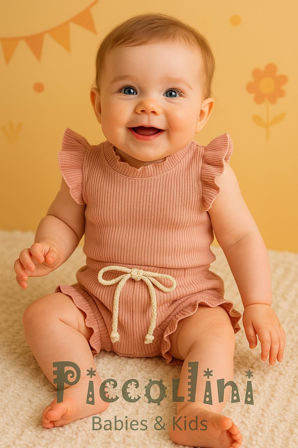 Hermoso conjunto de beba, compuesto por body y cubre pañal, confeccionados en algodón al 95% y elastano al 5% lo que forma un morley de algodón elastizado que no requiere planchado, con voladitos del mismo material en las terminaciones.