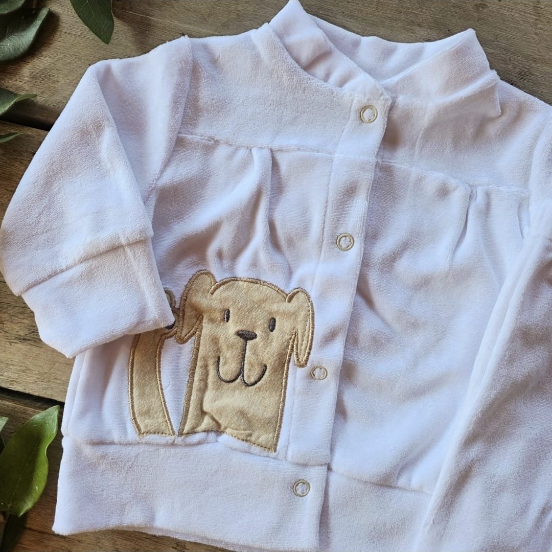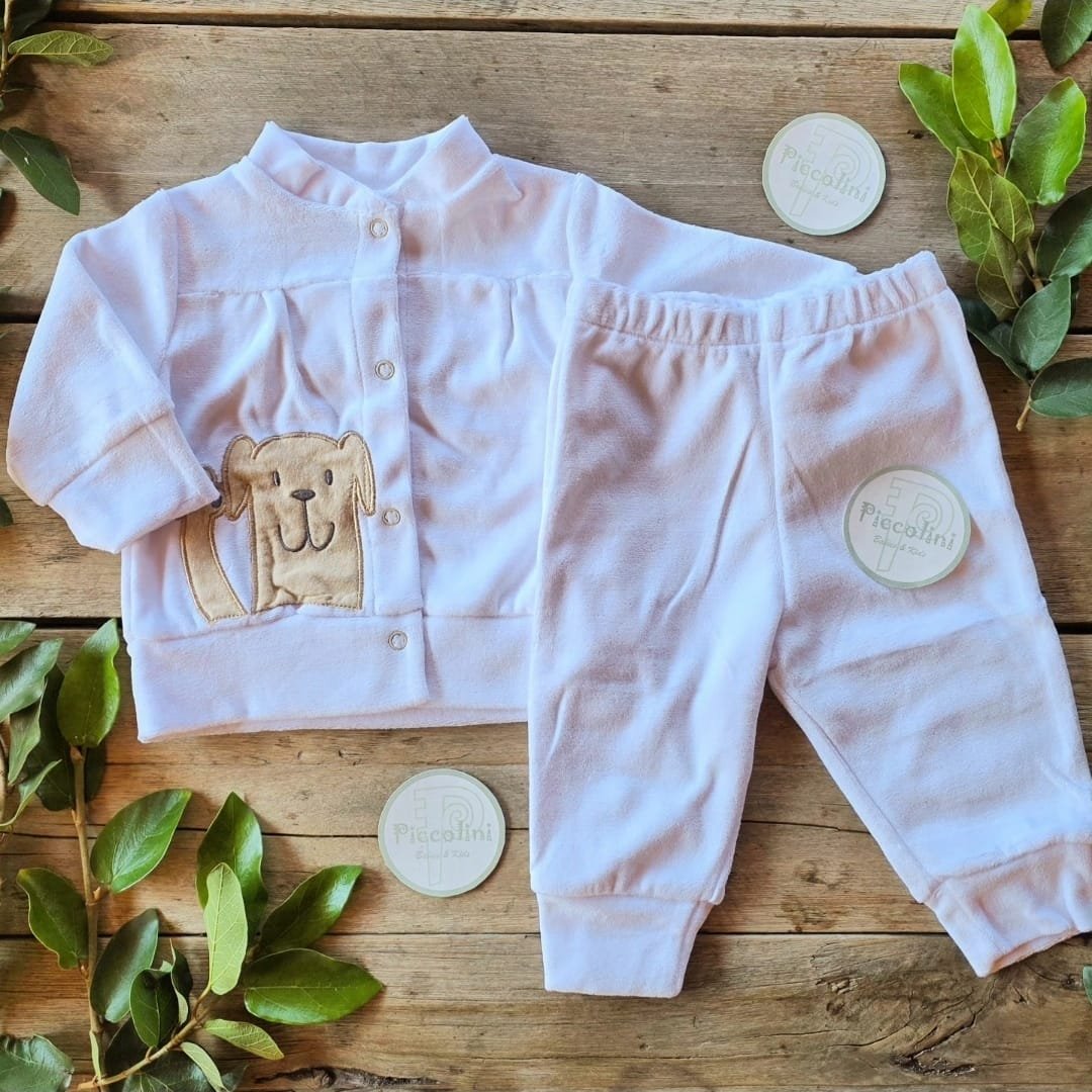Conjunto de camperita y pantaloncito confeccionados en plush super suave con perrito bordado en la camperita con cuello alto.