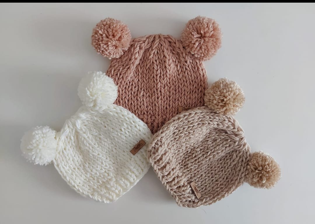Gorritos tejidos a mano en lana hipoalergénica con dos pompones que simulan las orejitas de un osito