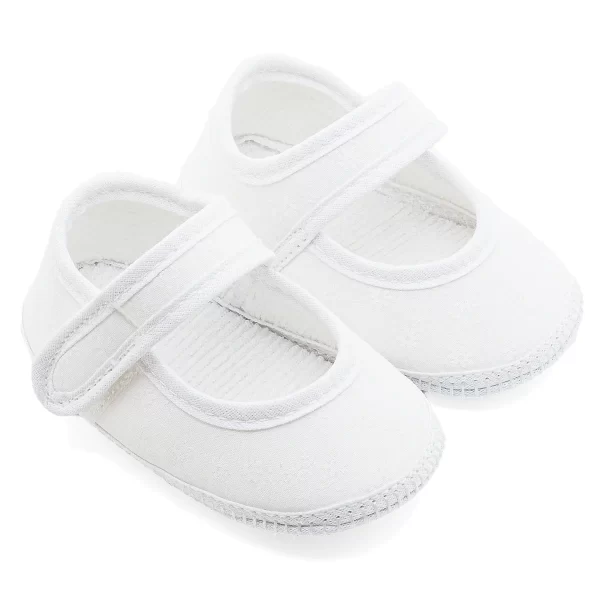 Guillermina pulserita clásica, cierre con velcro lateral: exterior en poplín (Algodón) estampado de flores blancas sobre fondo blanco, Estructura EVA FOAM que se adapta al pie conservando su forma sin comprometer la flexibilidad que el bebe necesita. Interior y plantilla de towell de algodón, suelin de PVC antideslizante.