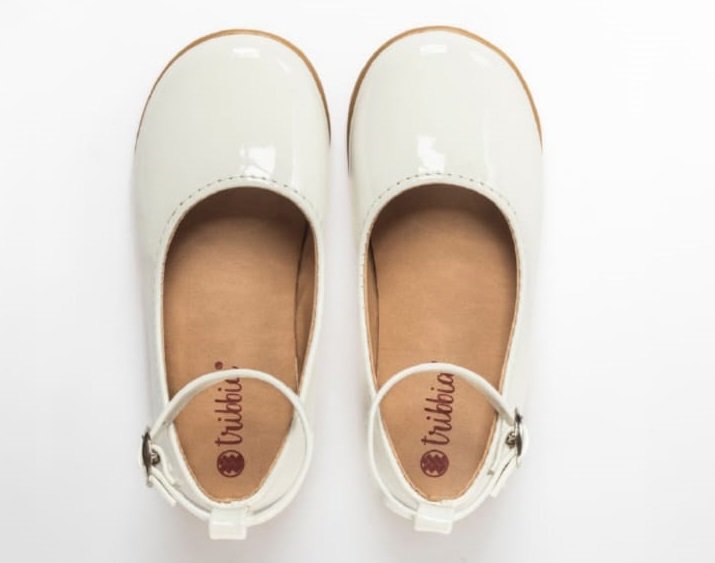 Calzado de niña modelo tipo guillermina, confeccionado en cuerina charolada blanca, con una pulserita del mismo material que ata en el tobillo