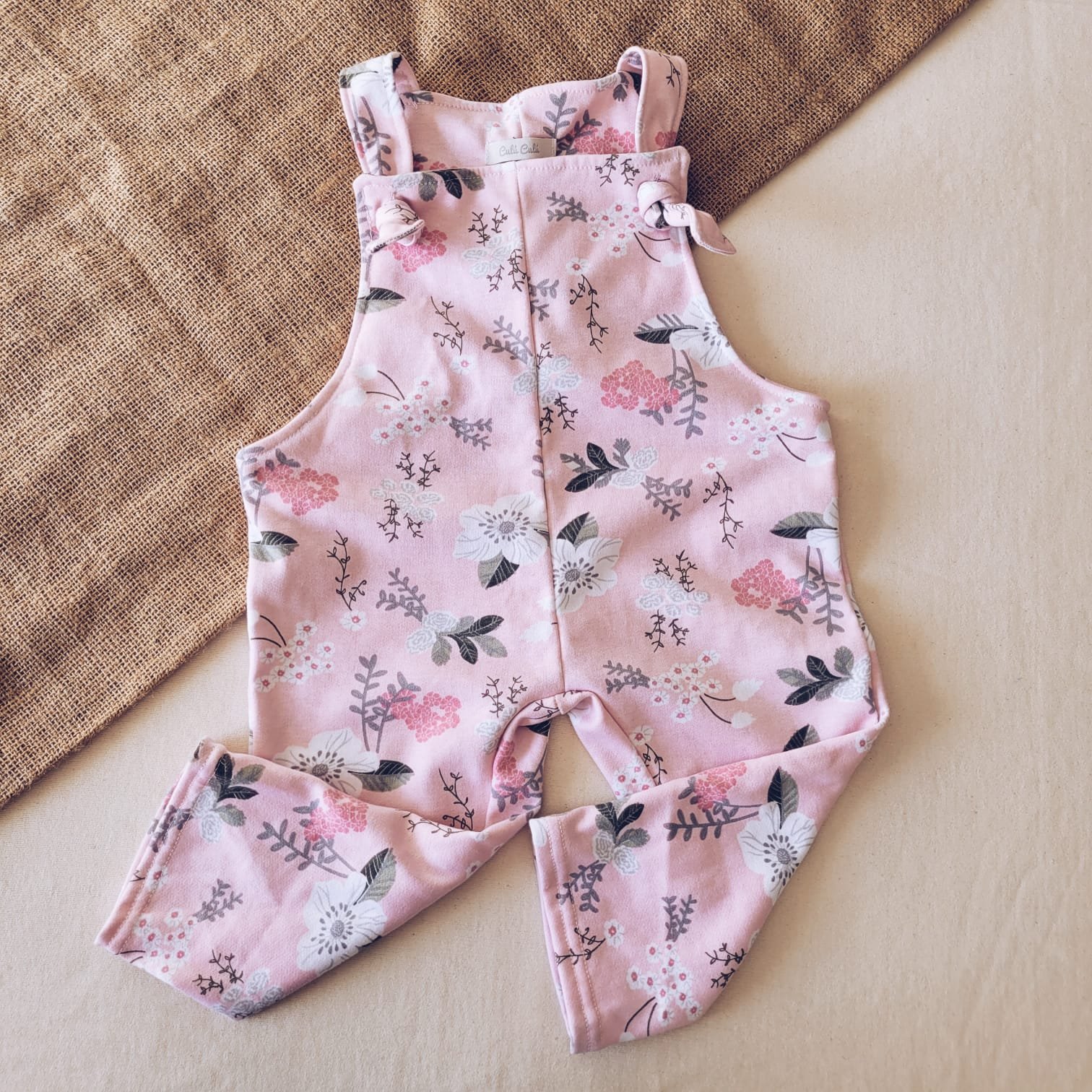 Jardinero de nena confeccionado en algodón rústico de primerísima calidad estampado, con breteles regulables con nuditos al frente y bolsillo canguro en la pechera.