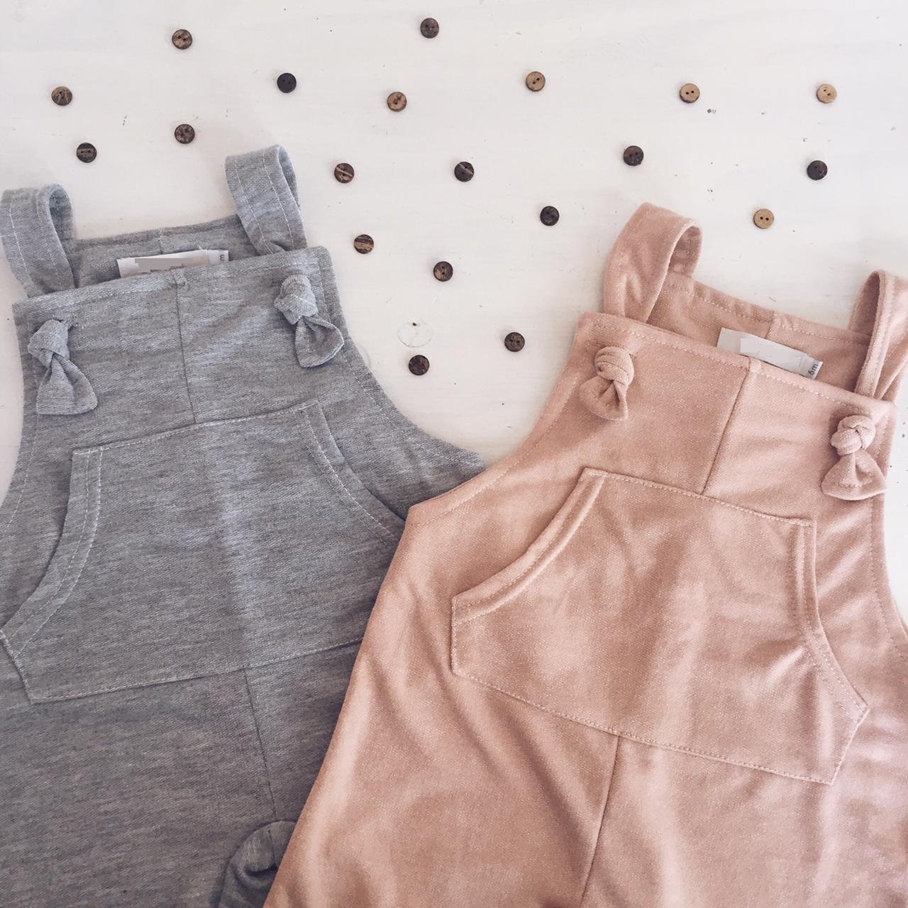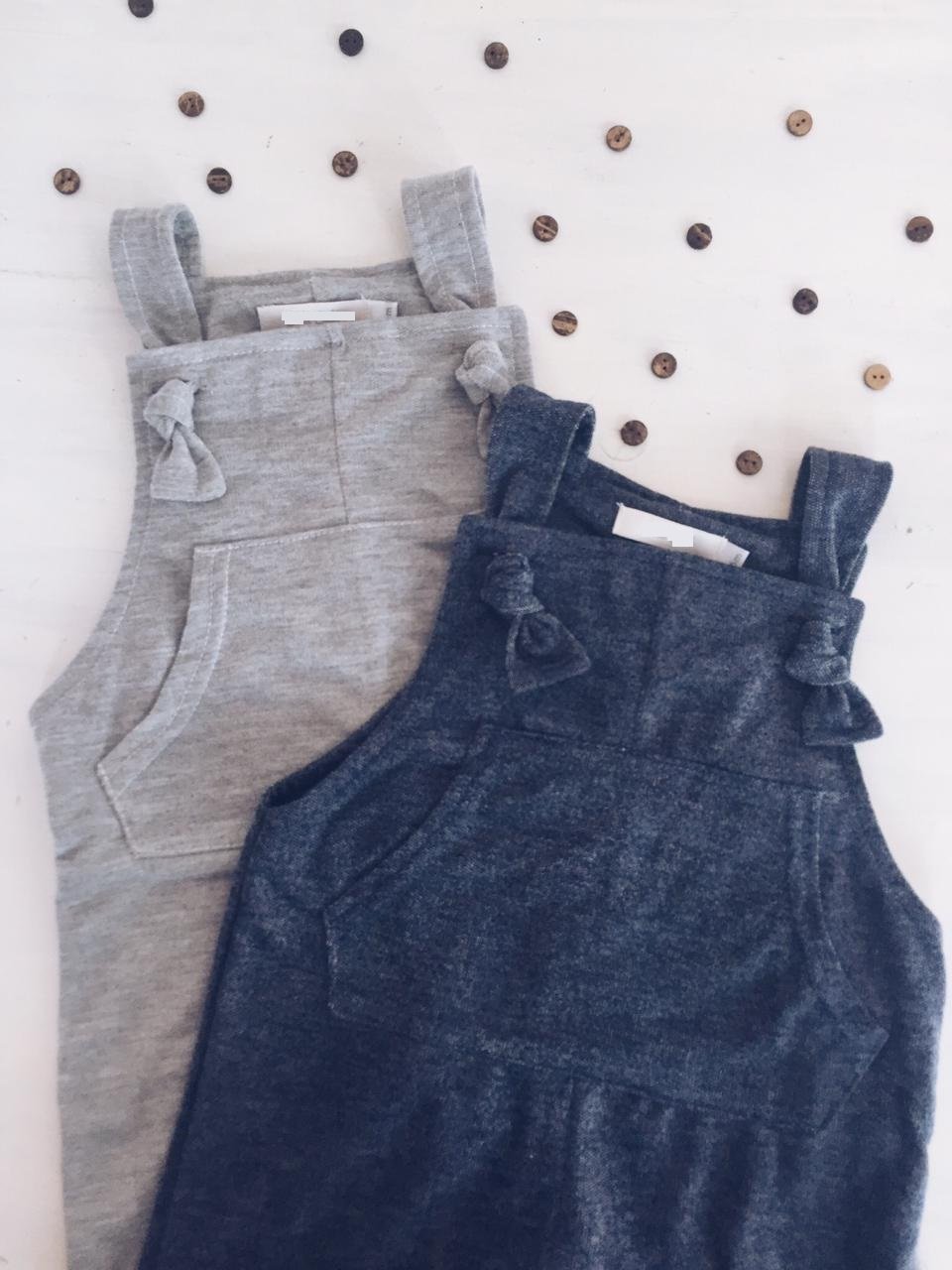 Jardinero de algodón rústico liviano con breteles regulables y bolsillo canguro en el pecho.