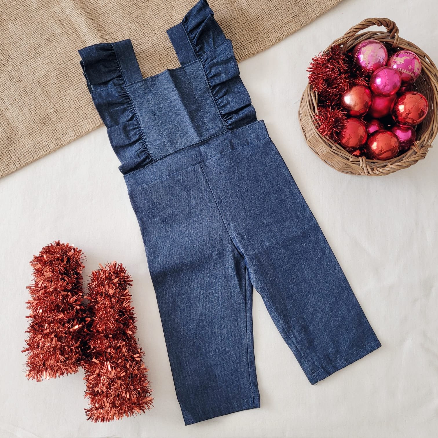 Jardinero confeccionado en jean liviano con breteles con volados regulables en la espalda con un moño y bosillito canguro en el pecho.