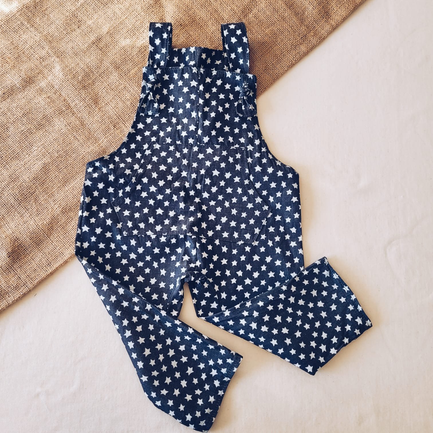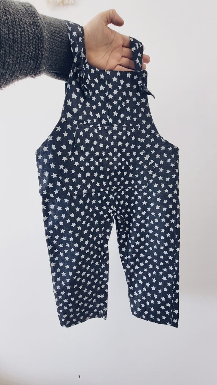 Jardinero confeccionado en estampado con estrellitas con breteles regulables al frente con nuditos y bosillito canguro en el pecho.