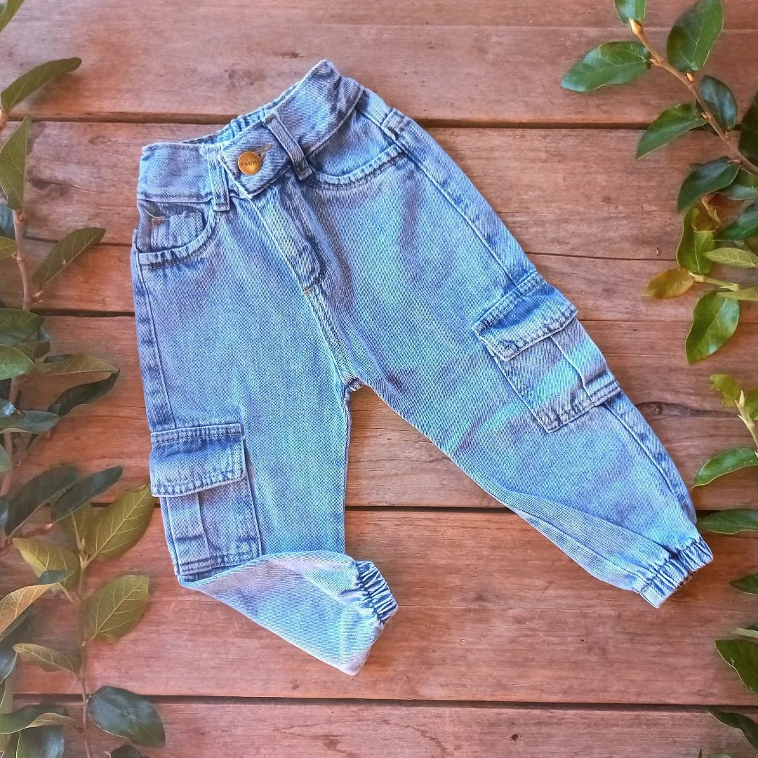 Jean tipo cargo unisex con elástico en los puños y cintura.