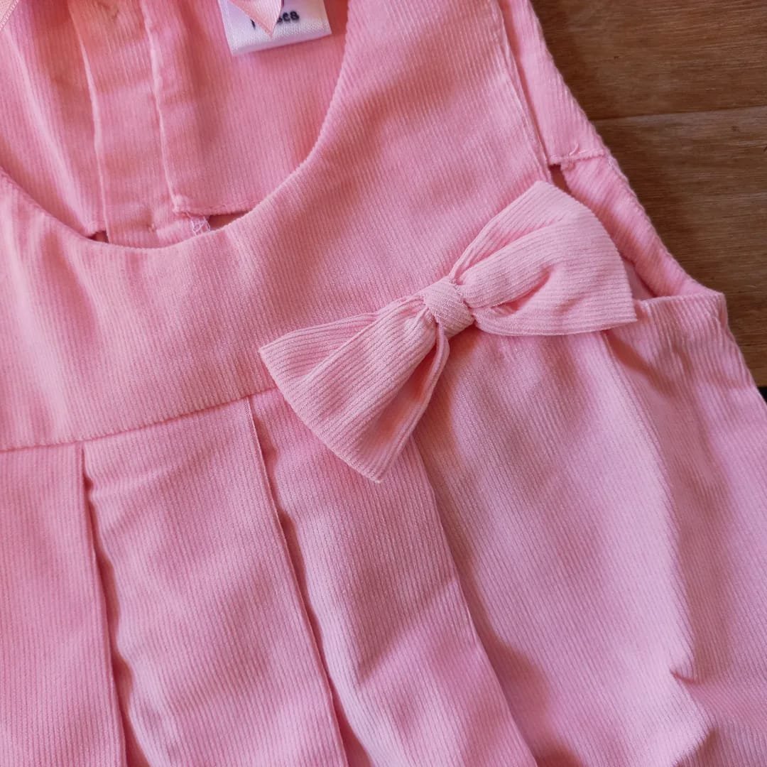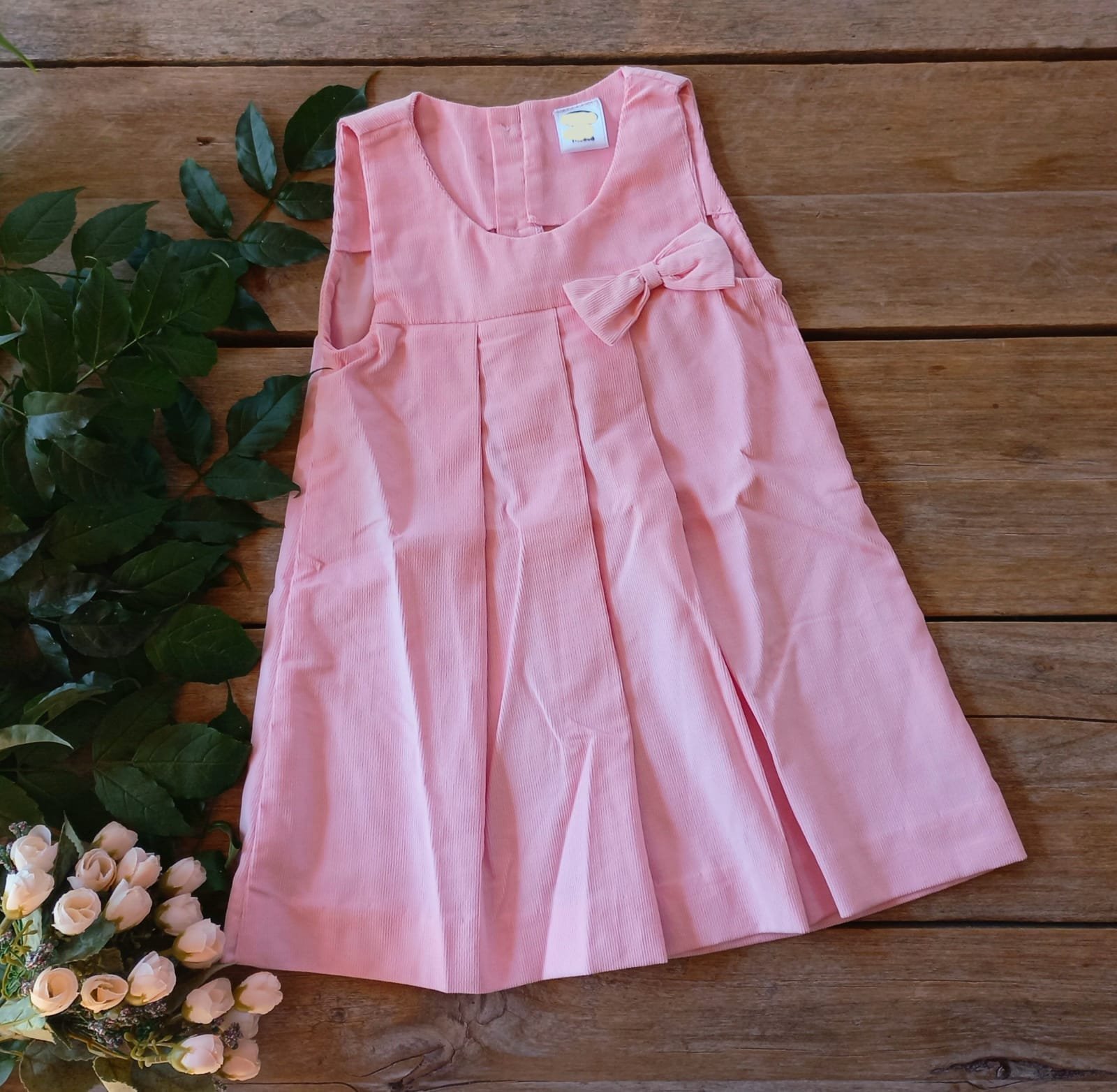 Este vestidito estilo jumper está confeccionado en corderoy. Viene tableado y con un moño de la misma tela en el pecho. Todo cosido a mano, es una prenda de excelente calidad.