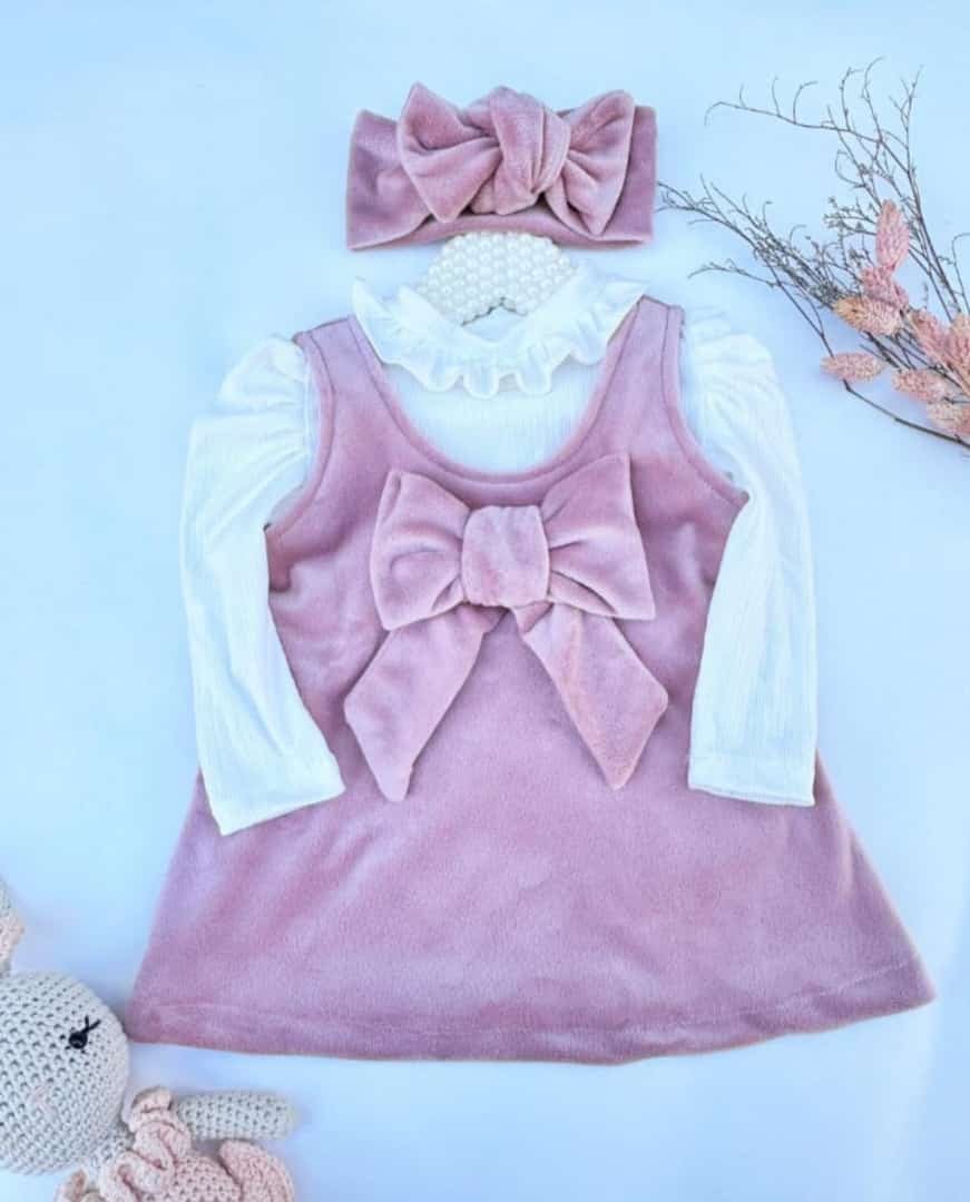 Jumper confeccionado en el mejor plush con detalle de moño en el pecho confeccionado en el mismo material y vincha haciendo juego en conjunto.