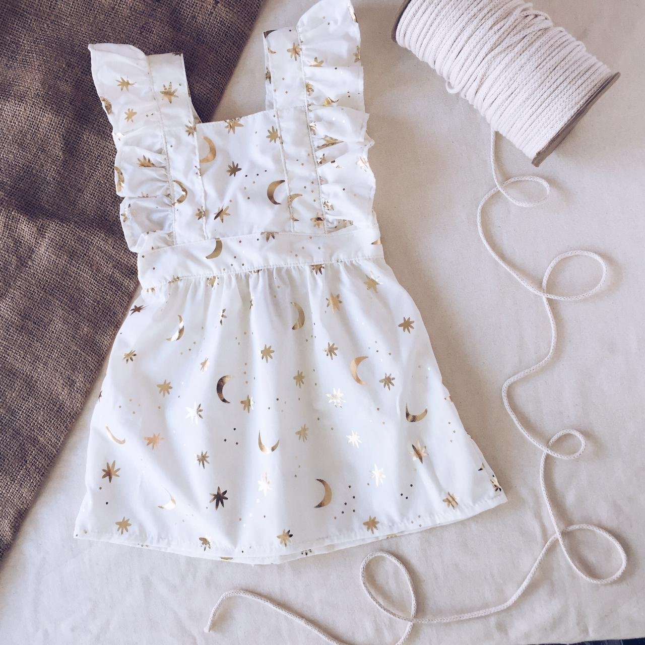 Jumper confeccionado en batista de algodón con detalles en foile dorado. Color natural con dorado. Es una tela delicada que debe lavarse a mano y plancharse del revés.