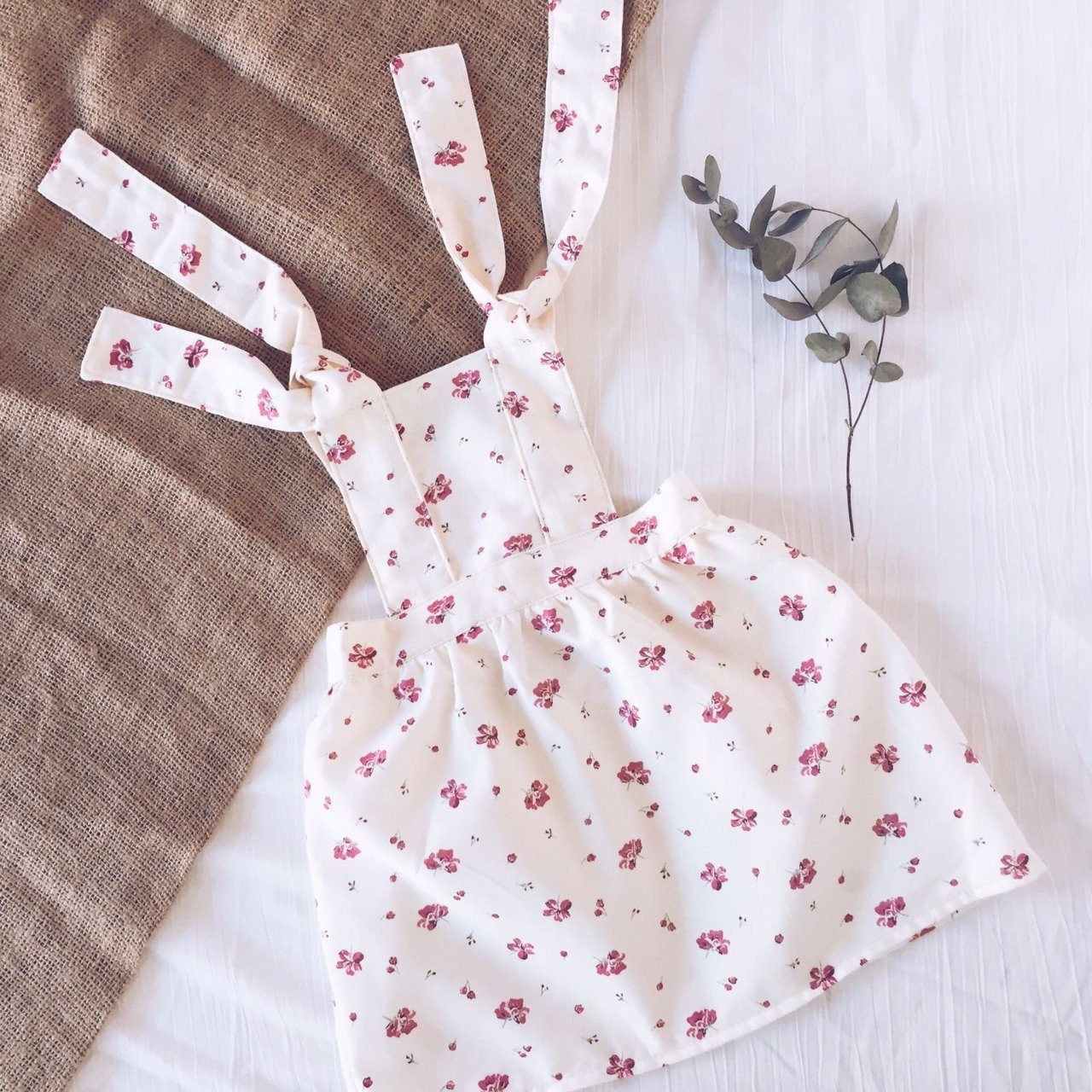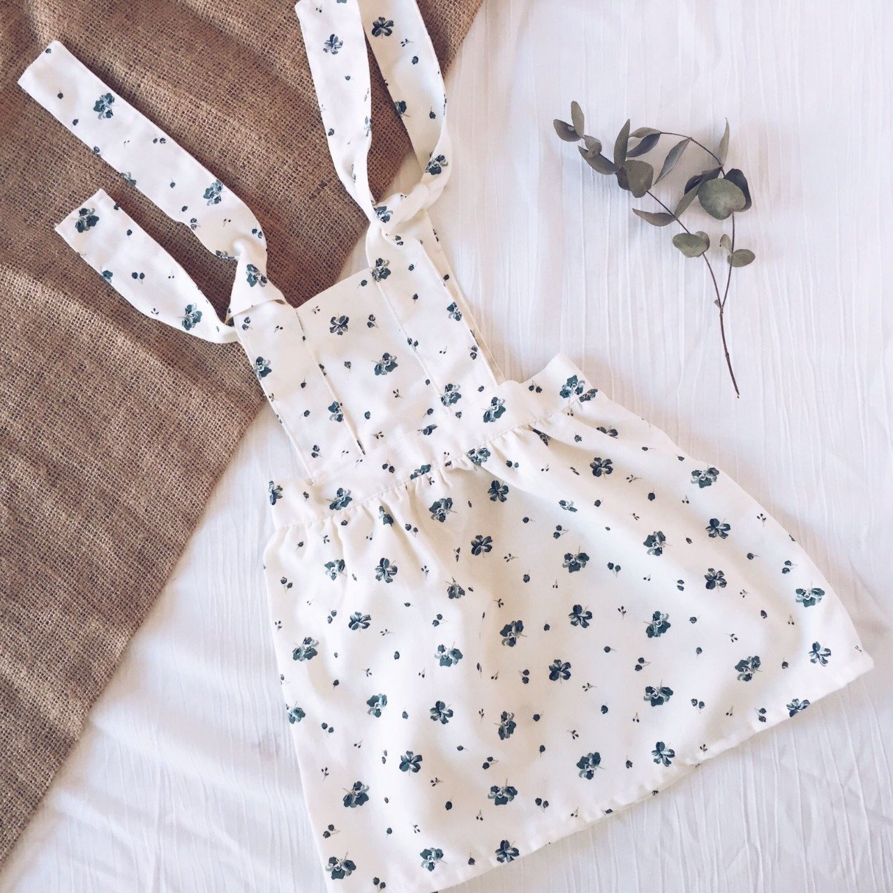 Jumper confeccionado en viyela de algodón estampa con fondo natural y pequeñas flores verdes y rosa. Breteles regulables que se atan por la espalda con moño o nudo. Se puede usar solo y dejar la espalda descubierta o con una remerita manga corta o manga larga para adaptarlo a media temporada.
