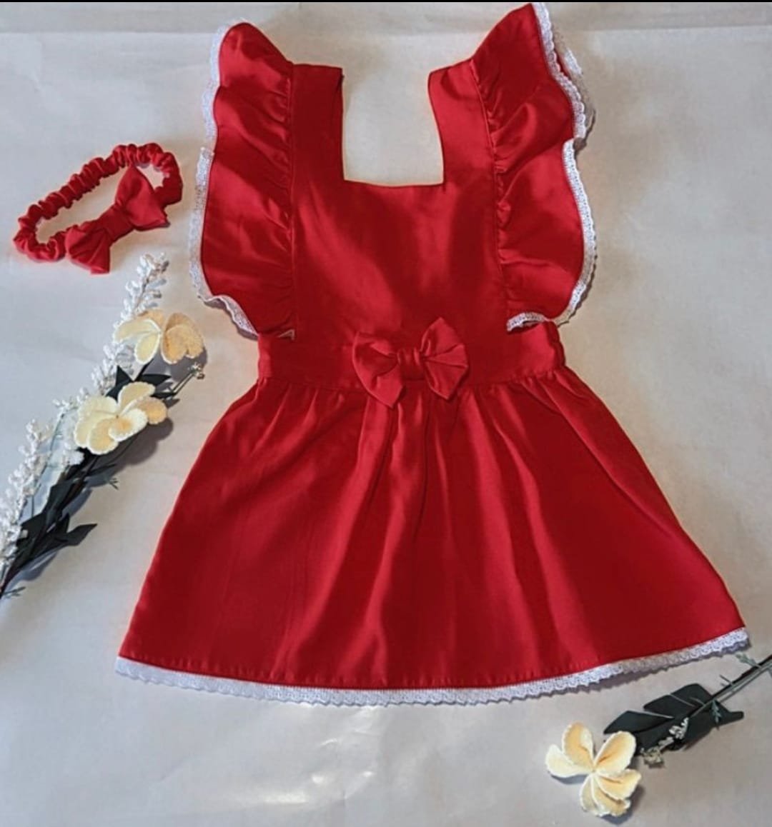 Jumper confeccionado en viyela de algodón con volados en los breteles y puntillas de algodón en breteles y ruedo. Tiene un moño en la cintura en la parte de adelante y viene con una vinchita haciendo juego.