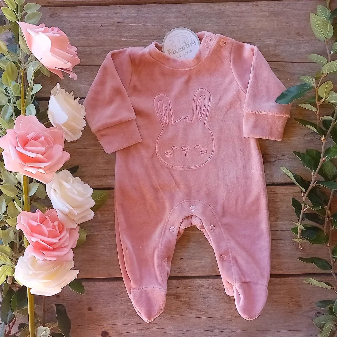 Enterito tipo osito confeccionado en plush de polyester con bordado de conejito en el centro. Con dos broches a presión en el cuello y cinco broches pañaleros.