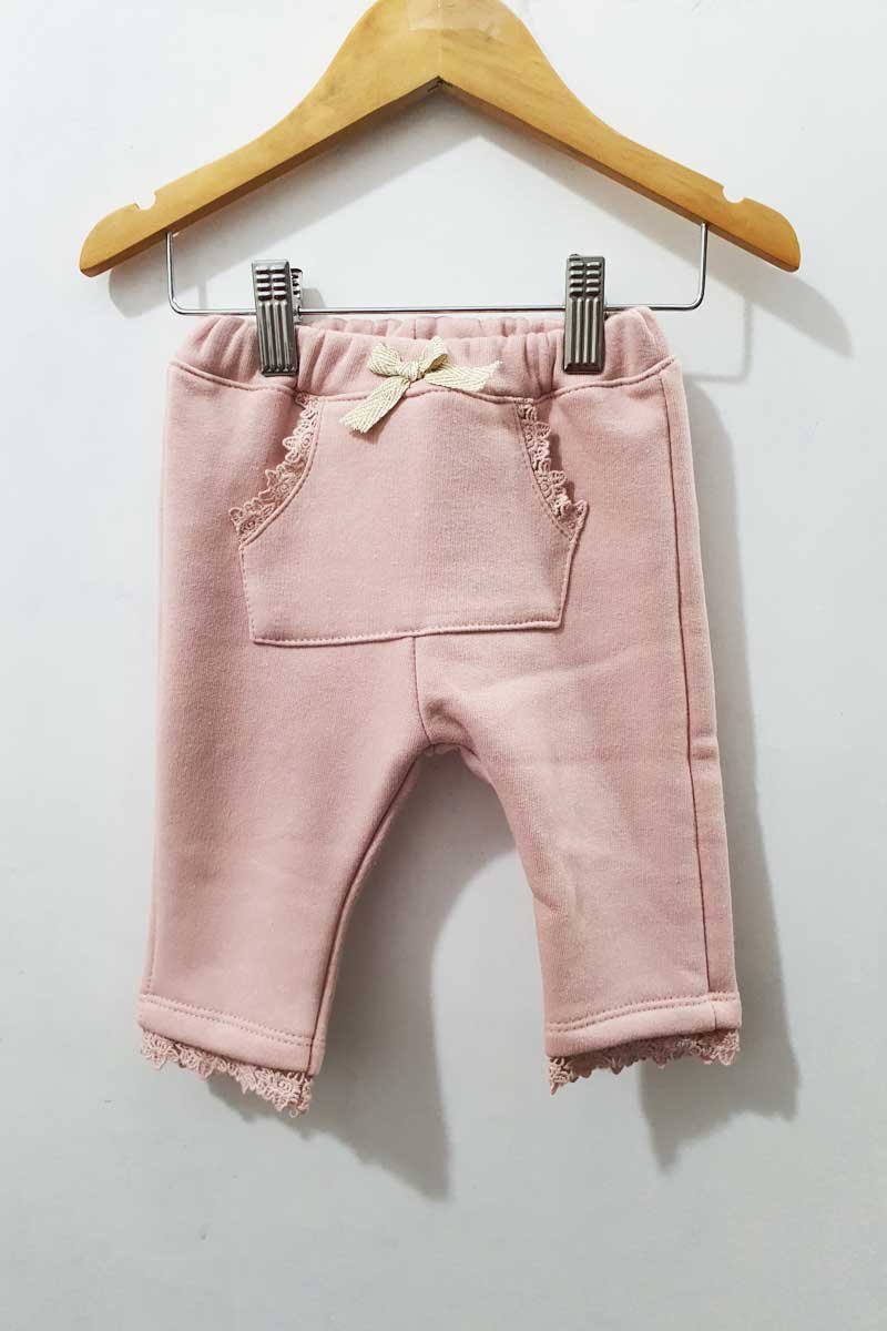 Pantalón frizado, bolsillo con puntilla y moñito.