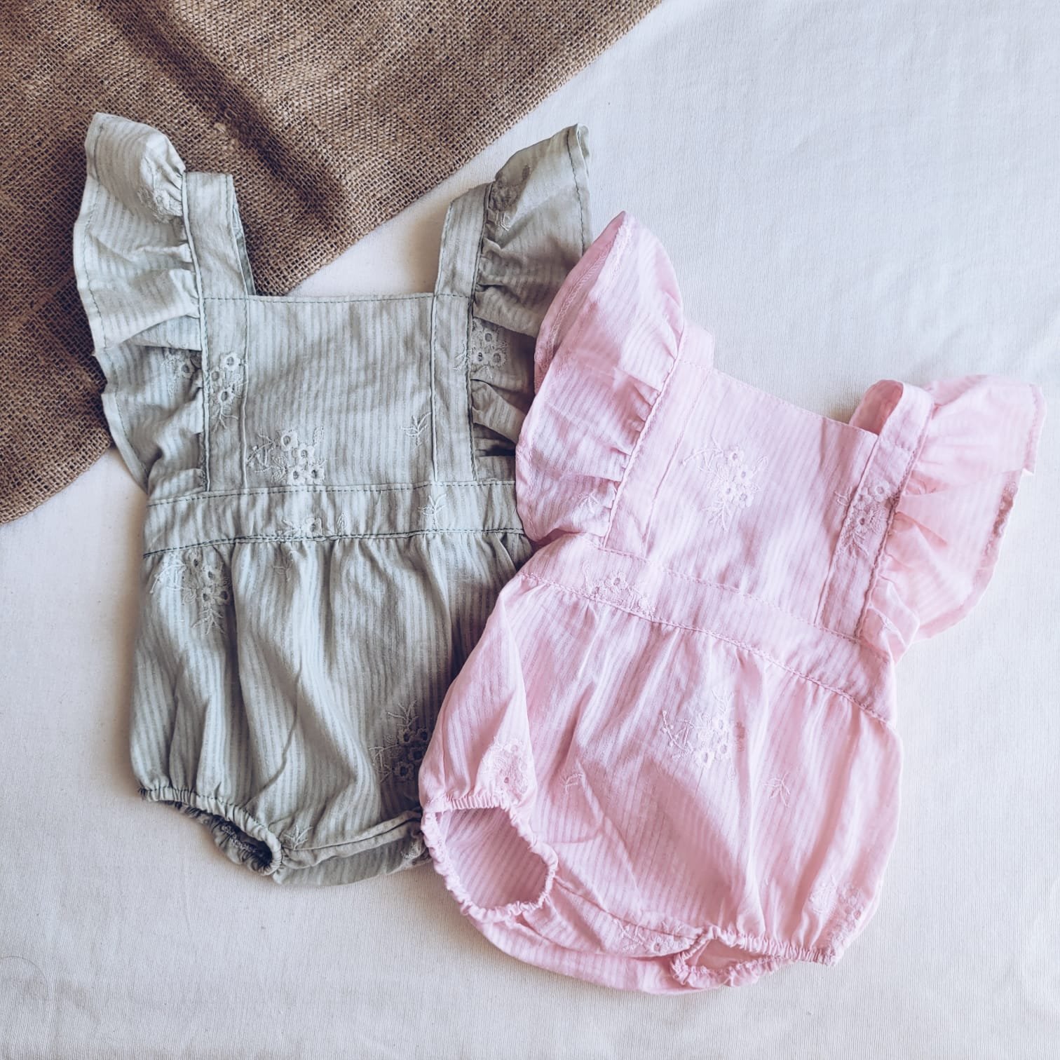 Pelele Vintage confeccionado en plana de algodón con detalles bordados y calados. Modelito bombachudo con breteles regulables que atan en la espalda. No posee broches pañaleros.