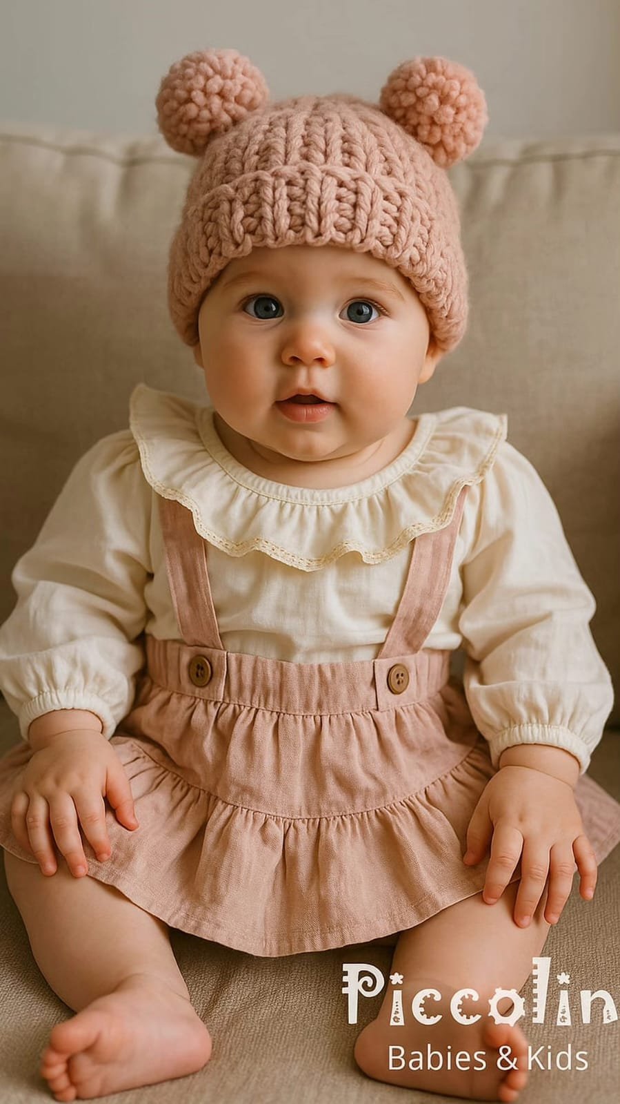 Pollera de beba con tiradores. Confeccionada en lienzo suave trae elástico en la cintura y volados amplios. Largo a la rodilla. Botones imitación coco.