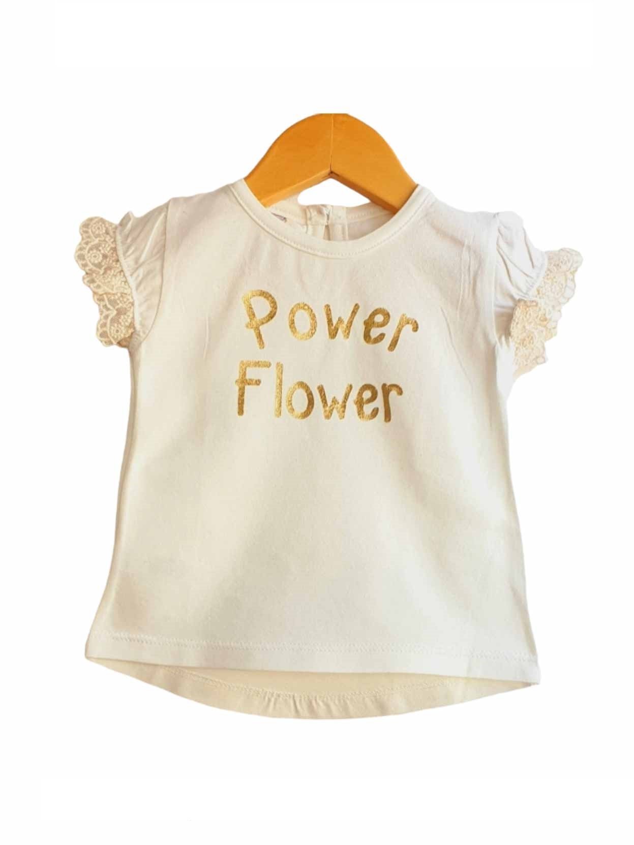 Remerita beba de manga corta confeccionada en jersey elastizado con lycra estampada en foil dorado con la frase Power Flower. Tiene detalles de frunces, elástico y puntillas en las mangas y un botoncito para abrir el cuello por detrás