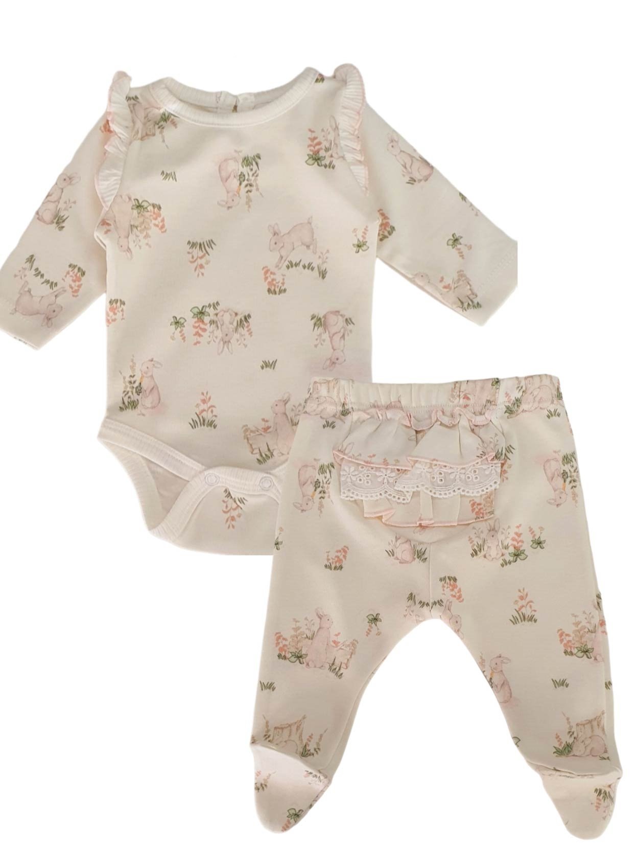 Set de beba, para recién nacido, hasta 2 meses, en el set viene, un body de beba manteca, con estampa de conejos, volados con frunce en hombros, dos broches pañaleros blancos, una ranita con pie cerrado, mismo color y estampa, con volados y broderie de algodón, viene con cajita (desarmada) para guardar el conjunto.